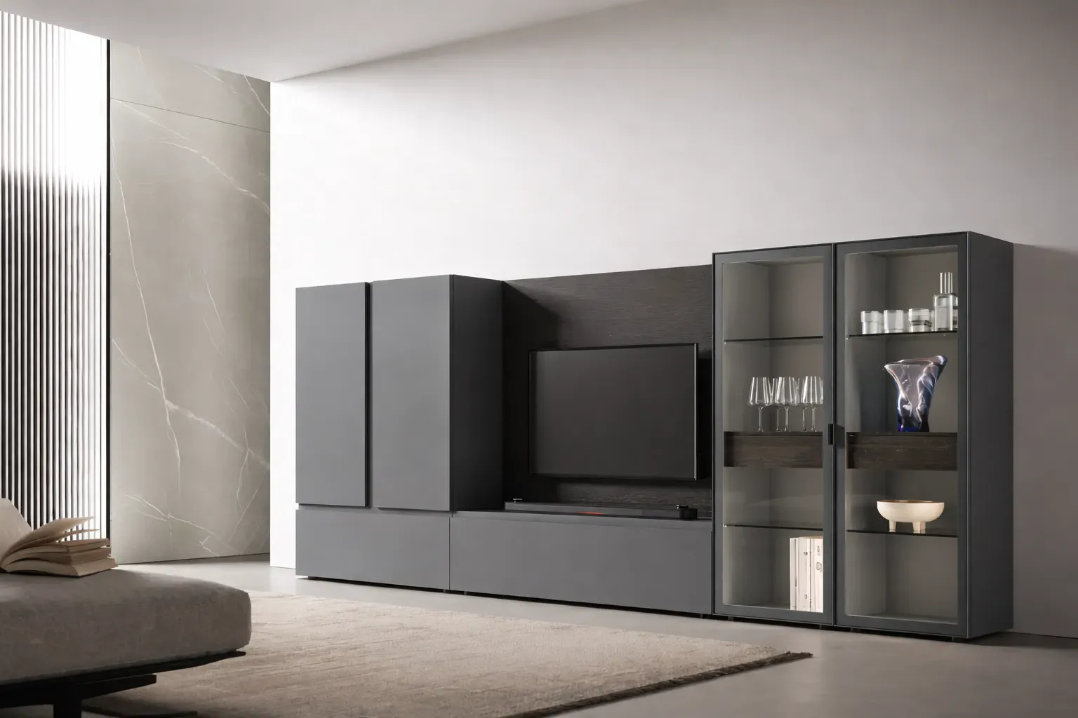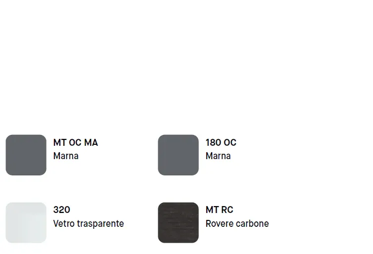 Le finiture esprimono uno stile sobrio e contemporaneo: il raffinato Marna domina la composizione con una tonalità neutra ed elegante, mentre il dettaglio in Rovere carbone dona profondità e carattere. Il vetro trasparente alleggerisce visivamente i volumi e valorizza gli oggetti esposti, creando un piacevole contrasto tra pieni e trasparenze.