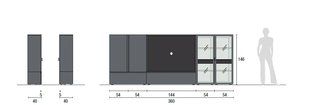 Le dimensioni complessive della composizione sono L 360 cm, P 5/40 cm, H 146 cm, con elementi così distribuiti: