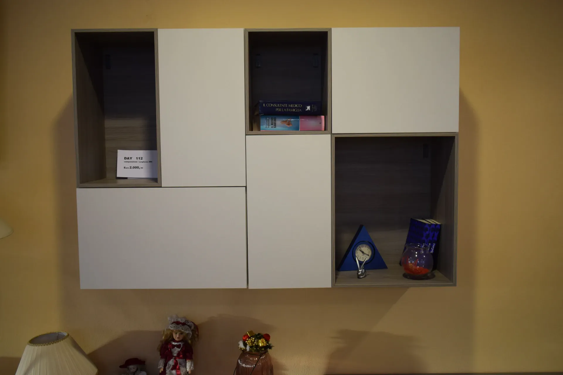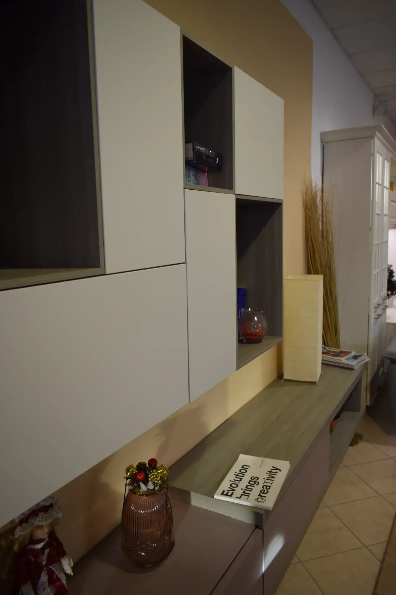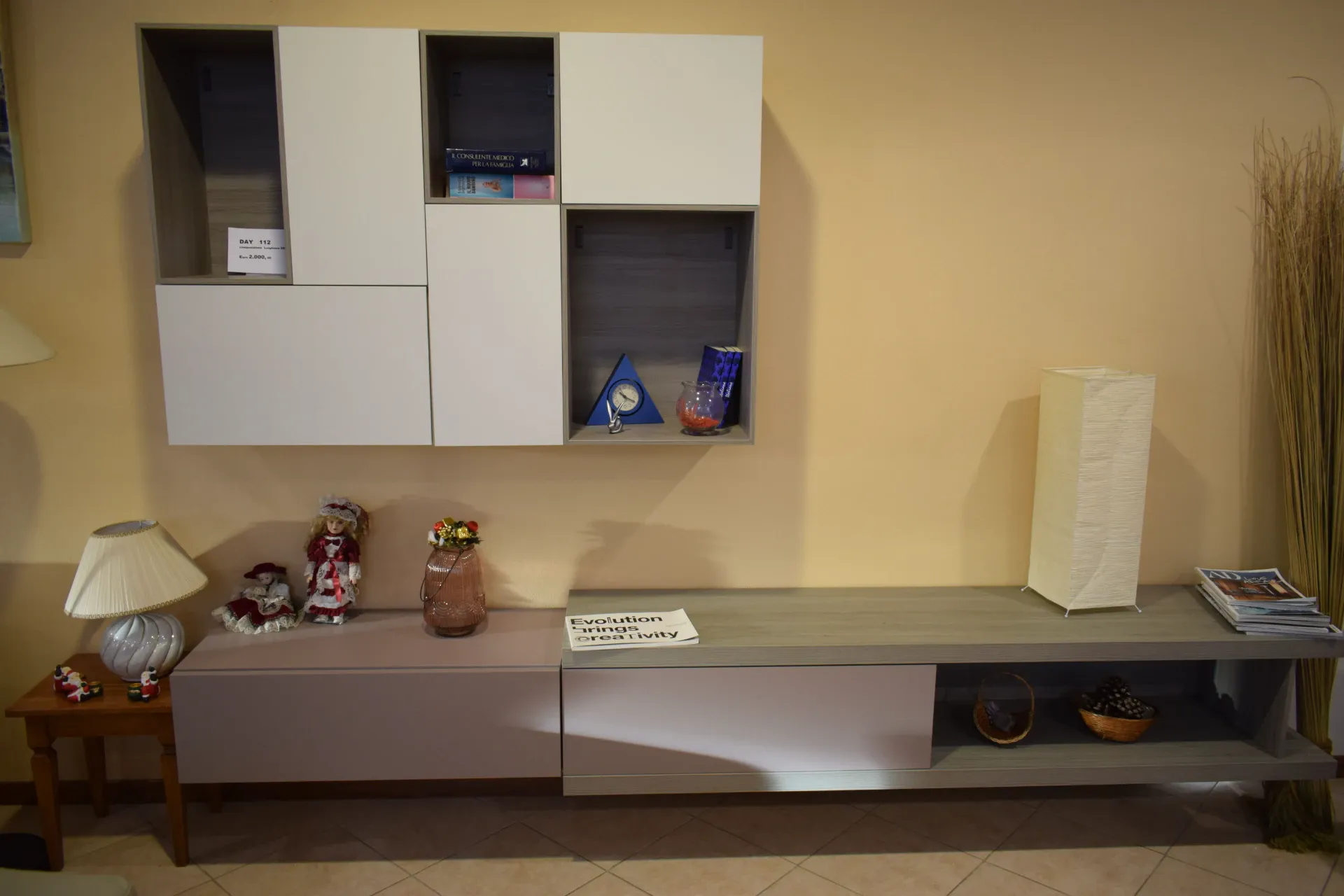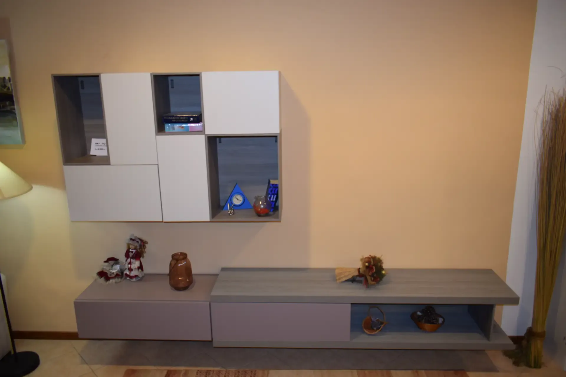 Composizione moderna con base sospesa e pensile con vani a giorno, senza maniglia apertura push pull. Porta tv, ampio spazio d'appoggio. Piano in finitura Frassino Ossidato venato, pensili sospesi in finitura laccato opaco Perla, cassetti laccato opaco Ortensia. Lunghezza base 285cm, Altezza 161.4cm e profondità massima 42cm. le basi sospese. Spedizione compresa nel prezzo in tutto il territorio nazionale. Composizione proposta scontata euro 1000. Per maggiori informazioni e preventivi contattaci via mail.