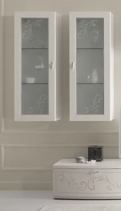 La parete attrezzata è il fulcro della stanza: mobili bianchi con decorazioni floreali delicate, ante in vetro satinato e una composizione ordinata che ospita la TV, elementi decorativi e contenitori chiusi. Le linee sono morbide, armoniose e ben bilanciate.