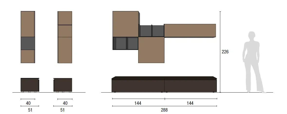 La composizione ha dimensioni complessive di L 288 cm, P 40/51 cm, H 226 cm ed è composta da: