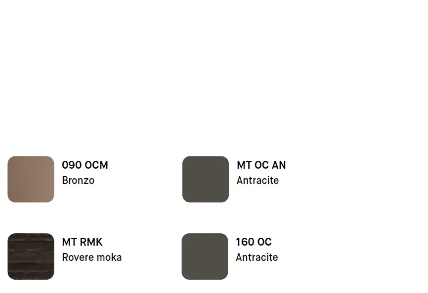 Le finiture esprimono un eleganza sofisticata e contemporanea: il Bronzo dona calore e un tocco ricercato, l Antracite definisce i contrasti con un carattere deciso e moderno, mentre il Rovere Moka aggiunge profondità e matericità con le sue venature scure.