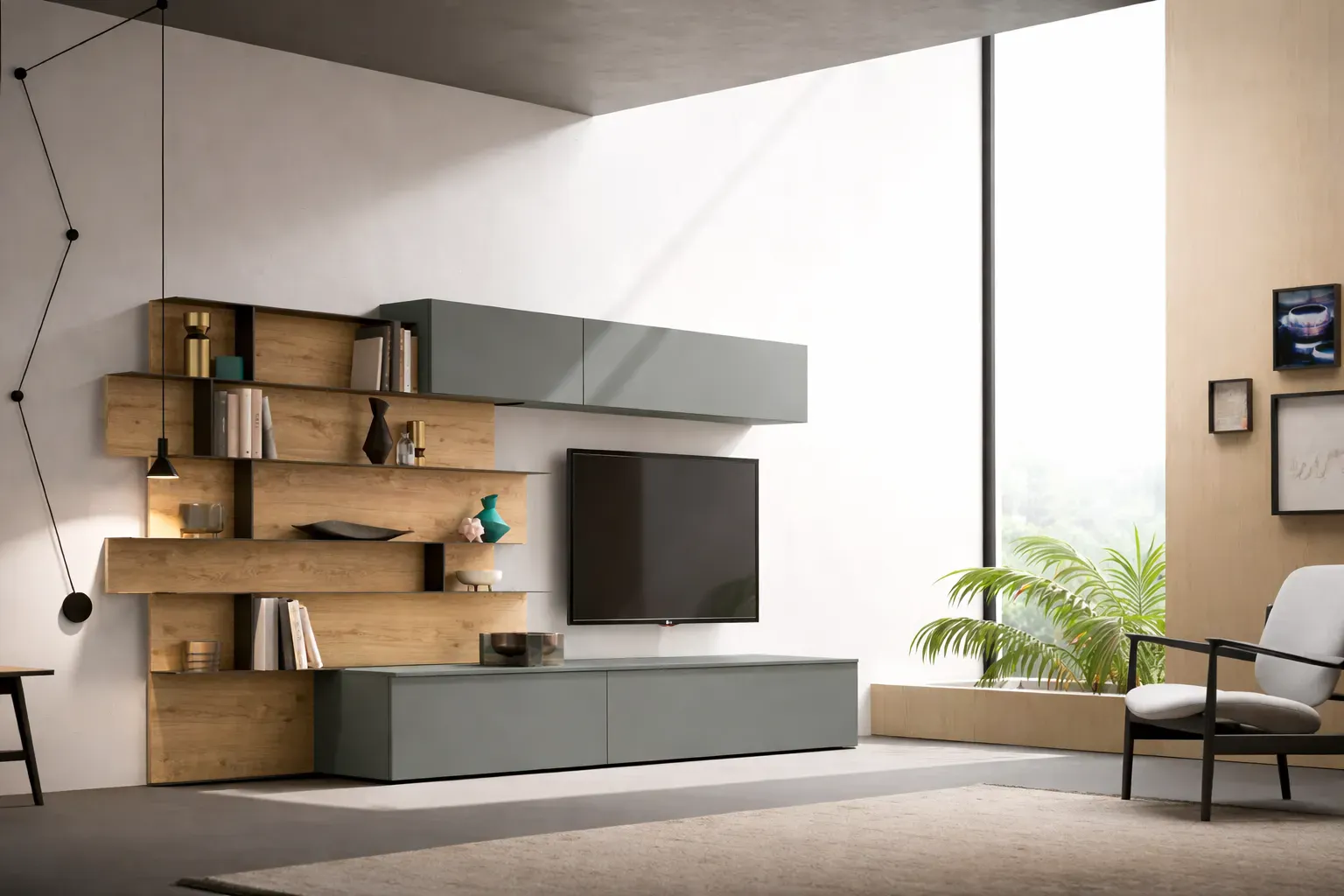 La composizione si sviluppa con una base solida composta da due contenitori a terra con 1 cestone in legno, che garantiscono ampia capacità contenitiva e una perfetta organizzazione dello spazio. La parte superiore è definita da pensili con apertura a ribalta in legno, ideali per mantenere un estetica pulita e lineare, mentre il top contenitore crea continuità visiva e rafforza l orizzontalità della composizione.