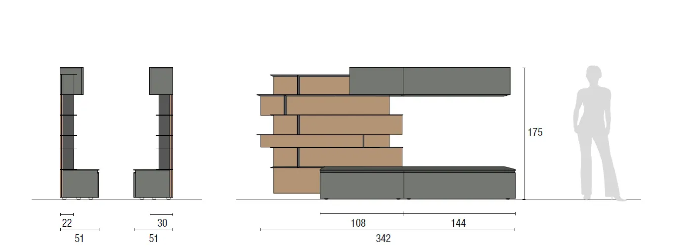 Le dimensioni complessive della composizione sono L 342 cm, P 22/30/51 cm, H 175 cm, con elementi così distribuiti: