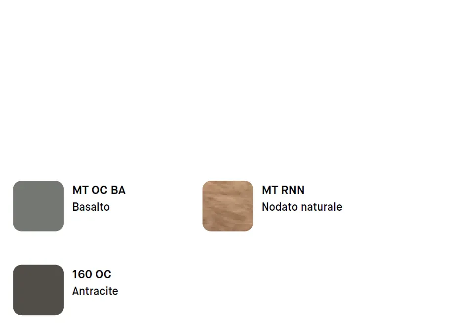 Le finiture esprimono uno stile deciso e contemporaneo: il profondo Antracite si combina con il materico Basalto, mentre il Nodato naturale introduce una nota calda e autentica, creando un contrasto equilibrato tra tonalità scure e naturali.
