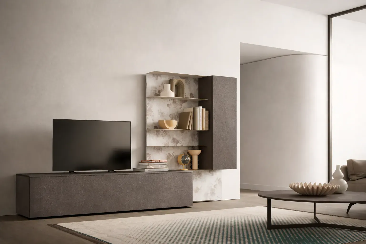 La boiserie crea un forte impatto visivo e dona profondità alla composizione, diventando elemento decorativo centrale perfetto per valorizzare la zona TV o living. Il top del contenitore completa l insieme con continuità estetica e funzionalità.