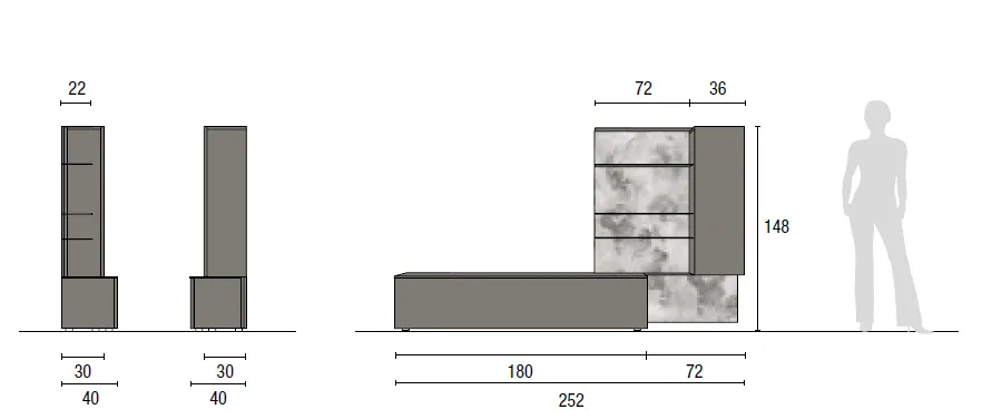 La composizione ha dimensioni complessive di L 252 cm, P 22/30/40 cm, H 148 cm ed è composta da: