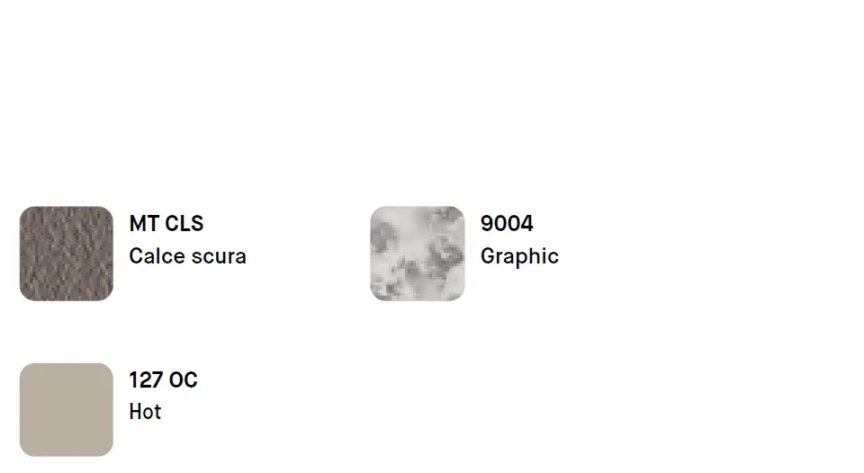 Le finiture sono protagoniste: la texture Calce Scura dona un effetto materico sofisticato e moderno, abbinata alla finitura Graphic per un look contemporaneo e ricercato. Il tono Hot introduce una nota calda ed equilibrata, creando un insieme armonioso e di grande personalità.