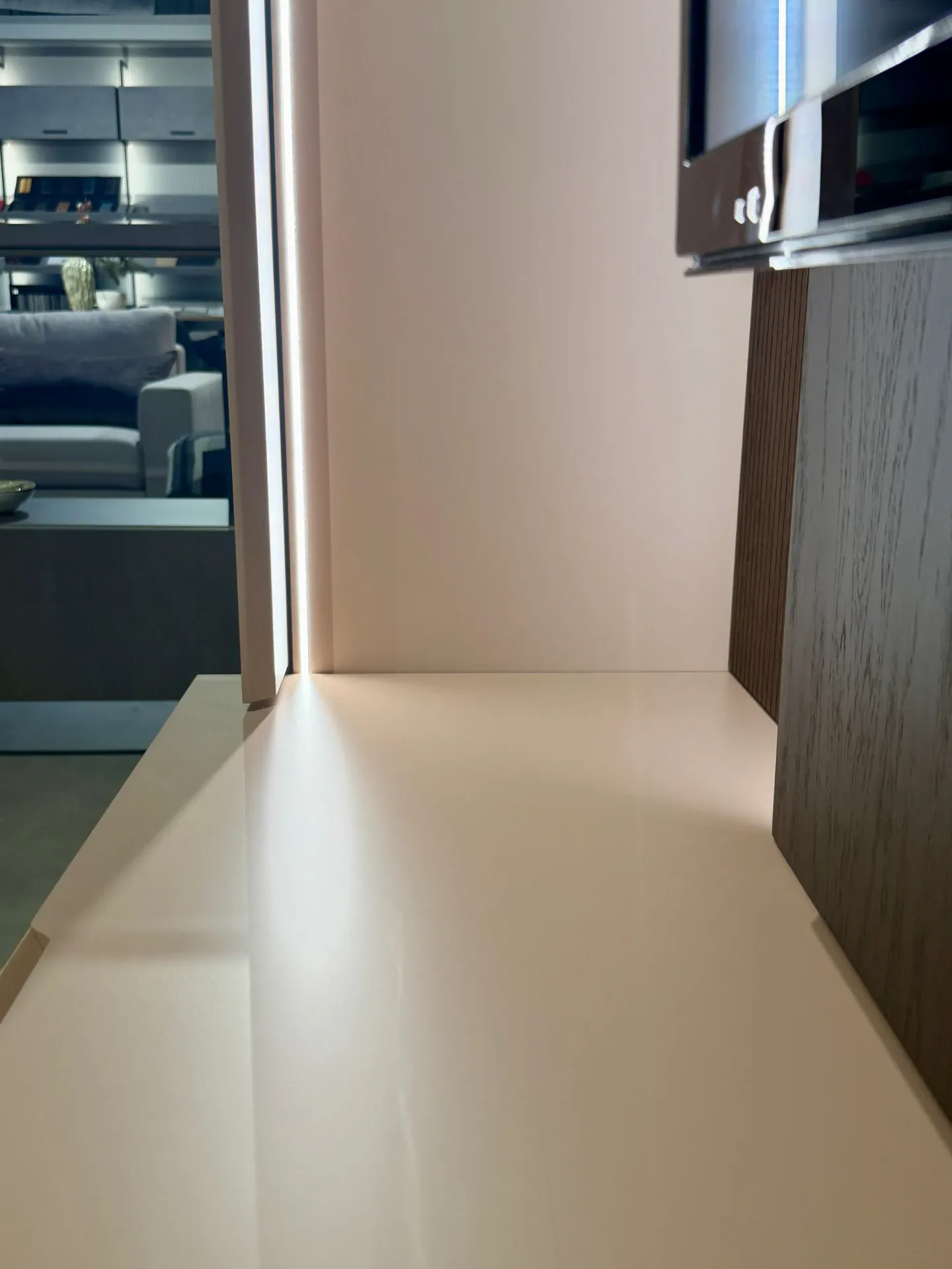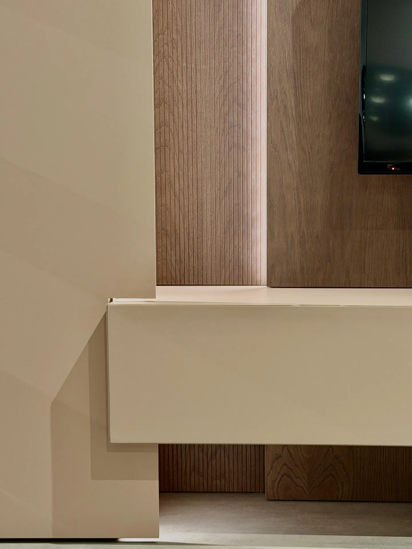 La finitura Rovere Moka dona calore e carattere, mentre il Cipria opaco aggiunge un tocco delicato e sofisticato, creando un equilibrio cromatico moderno e raffinato. La lavorazione cannettata impreziosisce l insieme con un effetto tridimensionale di forte personalità.