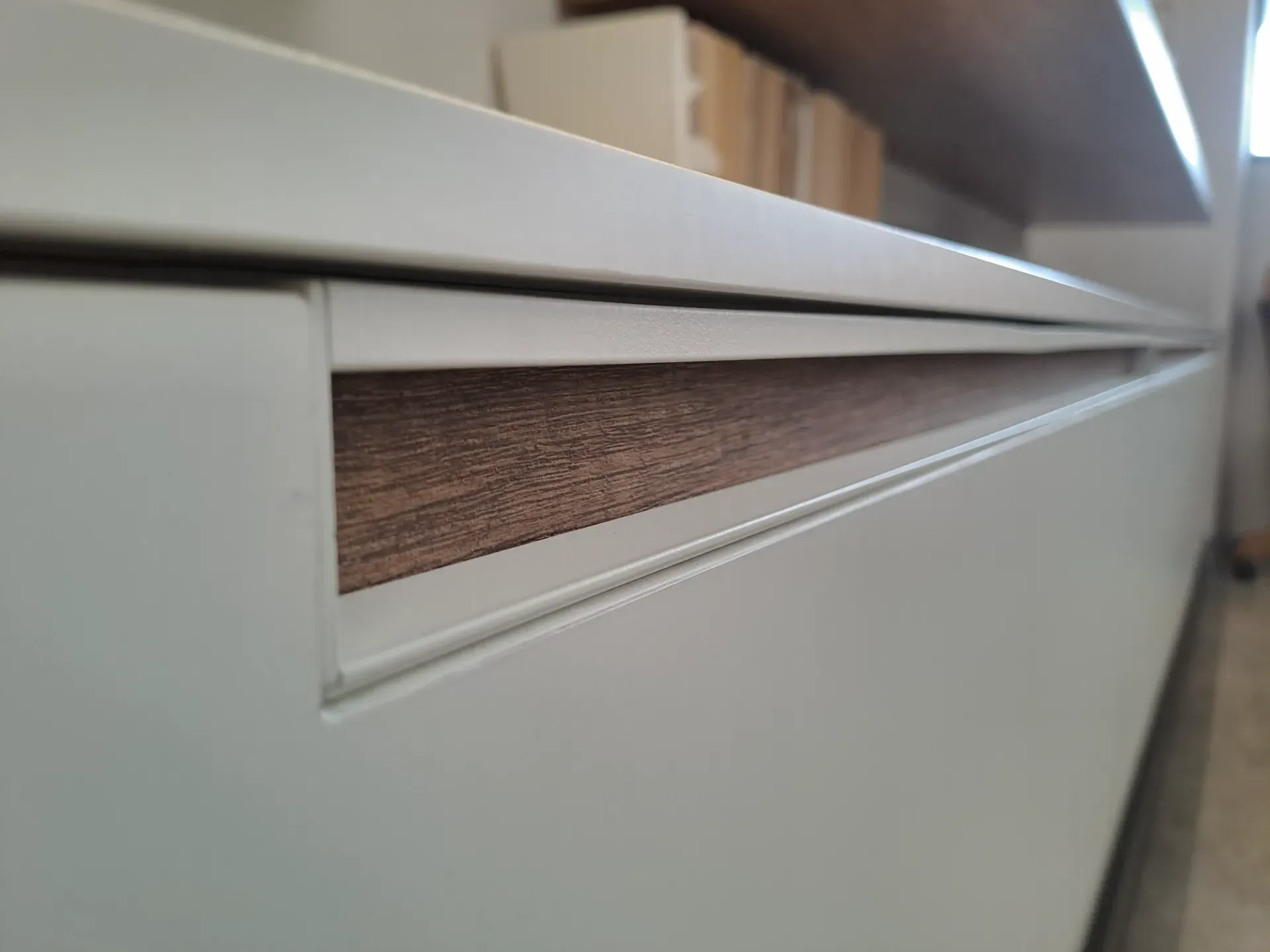 Questa soluzione fa parte della nostra serie di soggiorni completi con arredi senza maniglia del marchio Tomasella, ideali per spazi di ogni genere.
