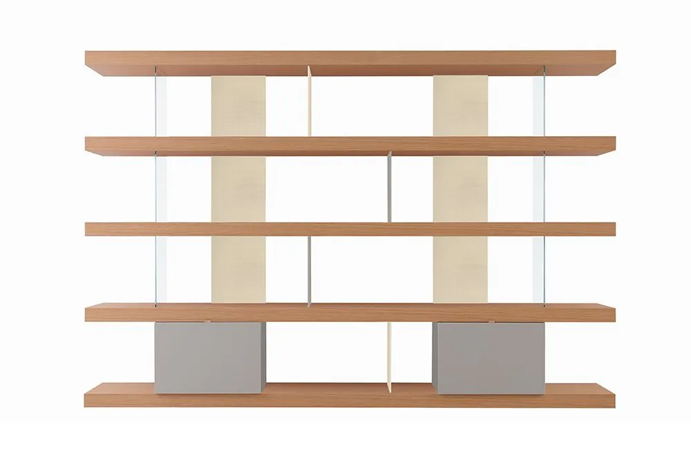 Libreria a pavimento autoportante bifacciale con piani orizzontali in tamburato di spessore mm 80, impiallacciati in Rovere Naturale, finitura opaca. Le linee verticali di spessore 8 mm, sono composte da cristalli extra chiari temperati e da pannelli di particelle di legno laccato opaco goffrato color Beige e Grigio Forme’s. Completano il sistema quattro contenitori a ribalta, laccati opaco goffrato color grigio Forme’s, all'interno un ripiano di mezza profondità. Dimensioni prodotto: L 300 × H 200.8 × P 42 cm.