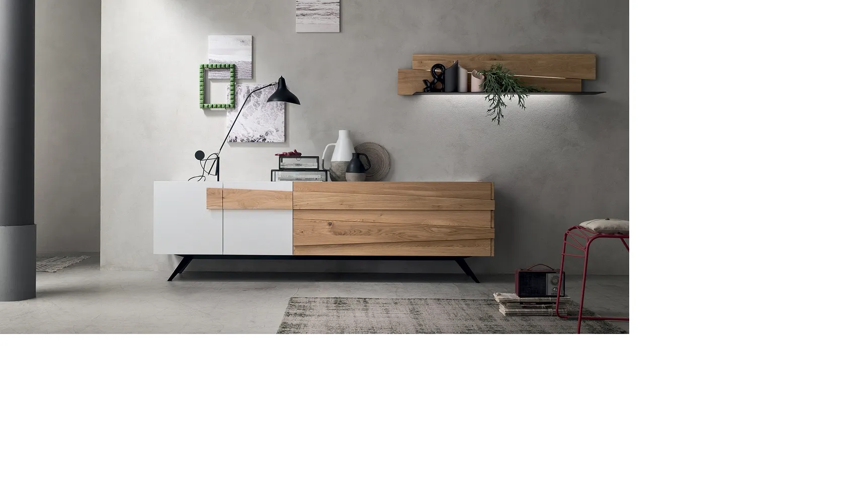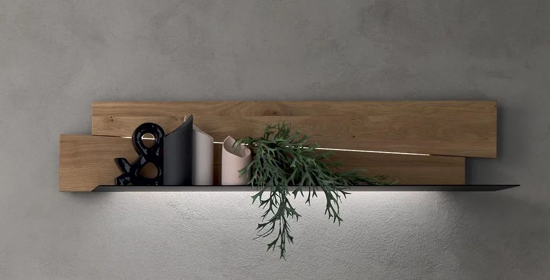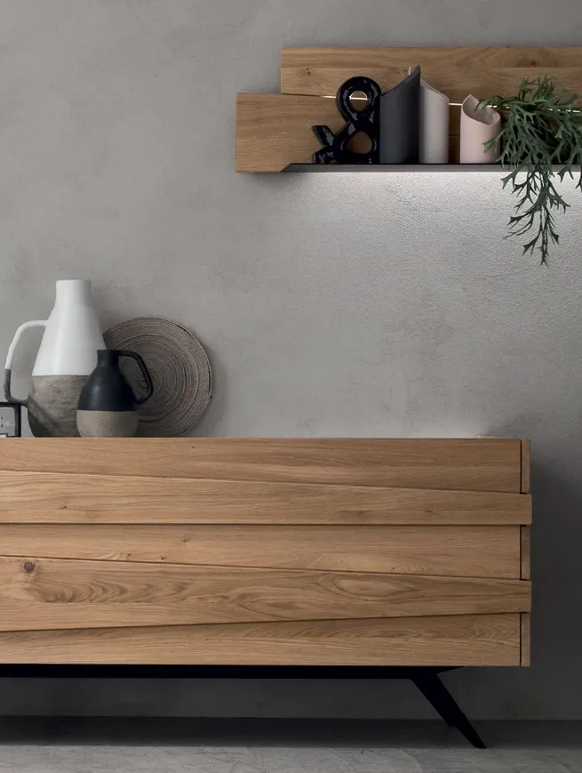 Madia contemporanea con basamento in metallo per un design più leggero. L'accostamento di doghe di legno rovere con forme e spessori diversi con il laccato bianco dona un'aspetto decisamente raffinato alla madia. La finitura del rovere con il suo colore naturale e la matericità del legno é adatta ad ambienti moderni e ad arredamenti contemporanei. I cassetti hanno guide blumotion con rientro ammortizzato. Le misure della madia sono l. 213,2 p. 50 h 63,6. La mensola l. 133,2 h 27,6 p. 25,5 legno rovere e metallo costa € 460,00 (luci escluse). Le luci a led con telecomando e dimmer costano € 120,00.
