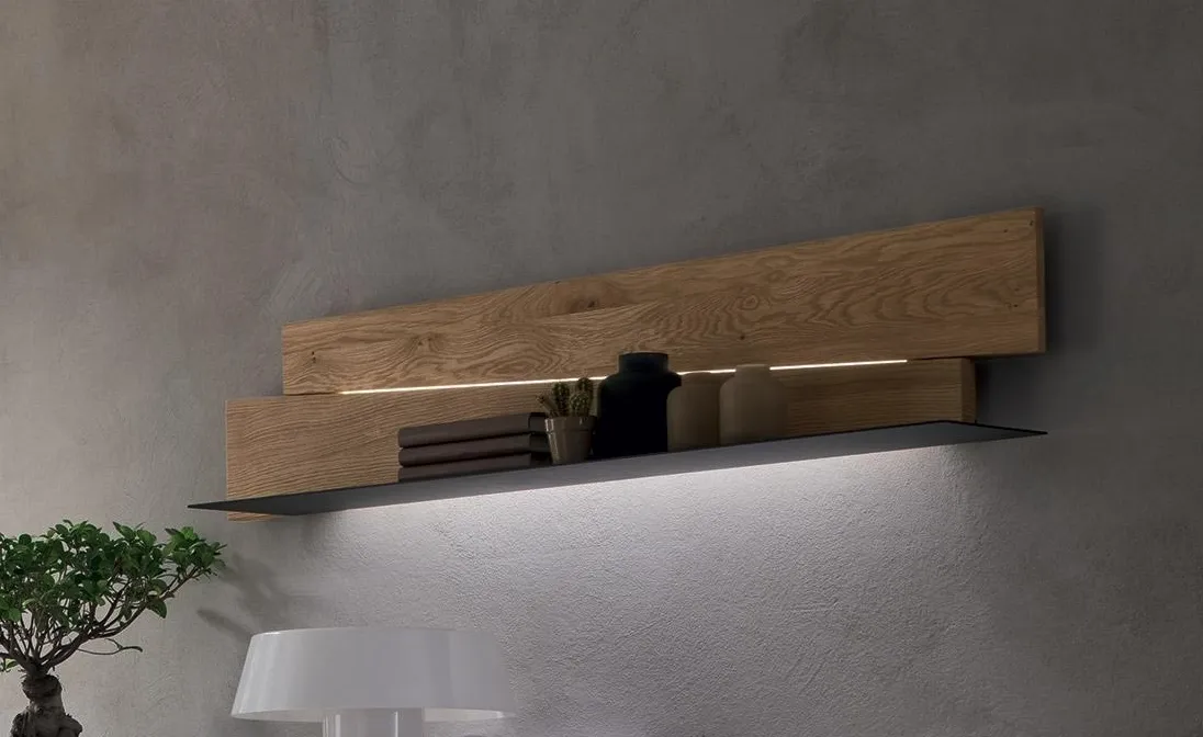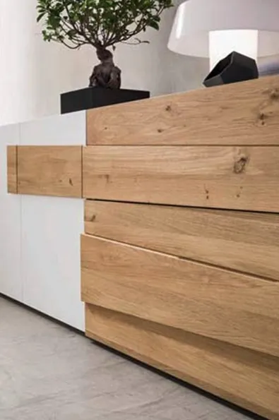 Una credenza contemporanea che arreda con l'autenticità del rovere massello. Il vero legno riveste la madia con elementi orizzontali di varie forme e dimensioni che creano un particolare effetto decorativo sulle superfici. Le doghe di legno che sembrano sovrapporsi leggermente creano una voluta irregolarità sulla madia dando un effetto molto naturale. I cassetti hanno di serie le guide blumotion con chiusura ammortizzata. Le misure della madia sono: l. 230,8 h 73,5 p. 50. Il prezzo scontato si riferisce alla madia come foto laccata bianco e rovere naturale. Il prezzo della mensola rovere e metallo l. 186 h 27,6 p. 25,5 (luce esclusa) é di € 670,00. Il prezzo delle luci a led con telecomando e dimmer é di € 165,00. . La madia é disponibile anche nella misura l. 213 e l.850,00. nella misura l. 178 a € 1.740,00