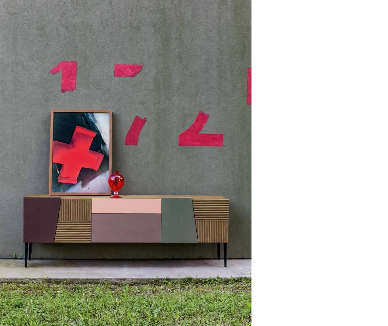 La madia porta tv Zero. 16 di Devina Nais, grazie alle sue proporzioni eleganti e leggere presenta in chiave contemporanea questa particolare tipologia di mobile contenitore. Le ante e i frontali in legno massello lavorato a righe si alternano con quelli laccati a poro aperto, nei nuovi e giovani colori del campionario Devina Nais. Le alte e sottili gambe in ferro conferiscono alla madia una leggerezza e uno stile particolare. Questa versione è composta da quattro ante battenti e due cassetti.