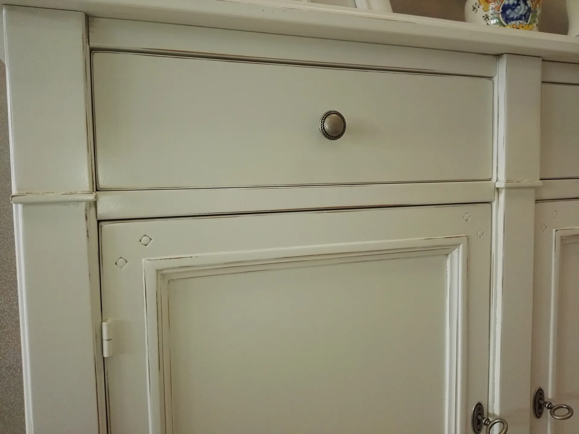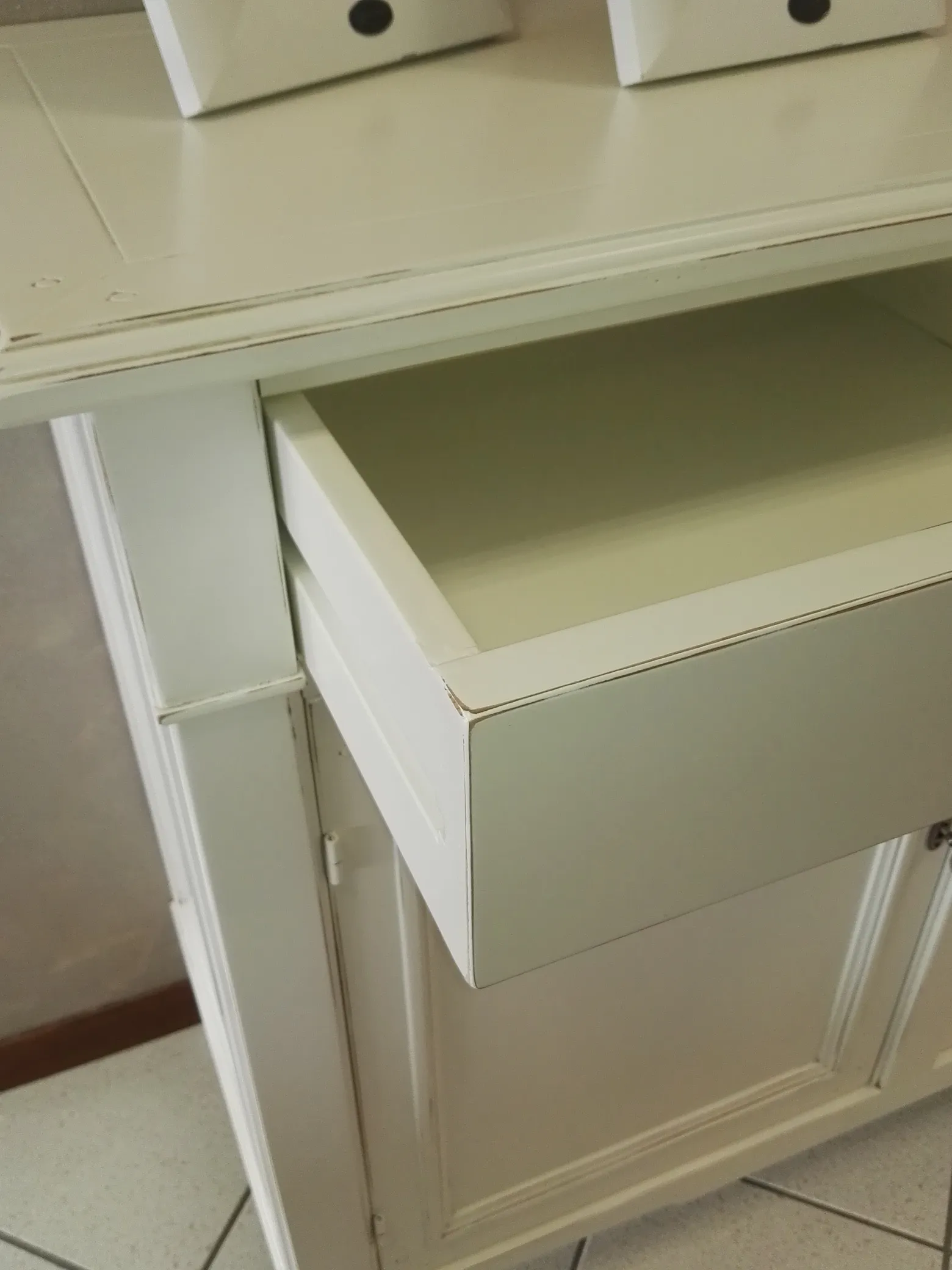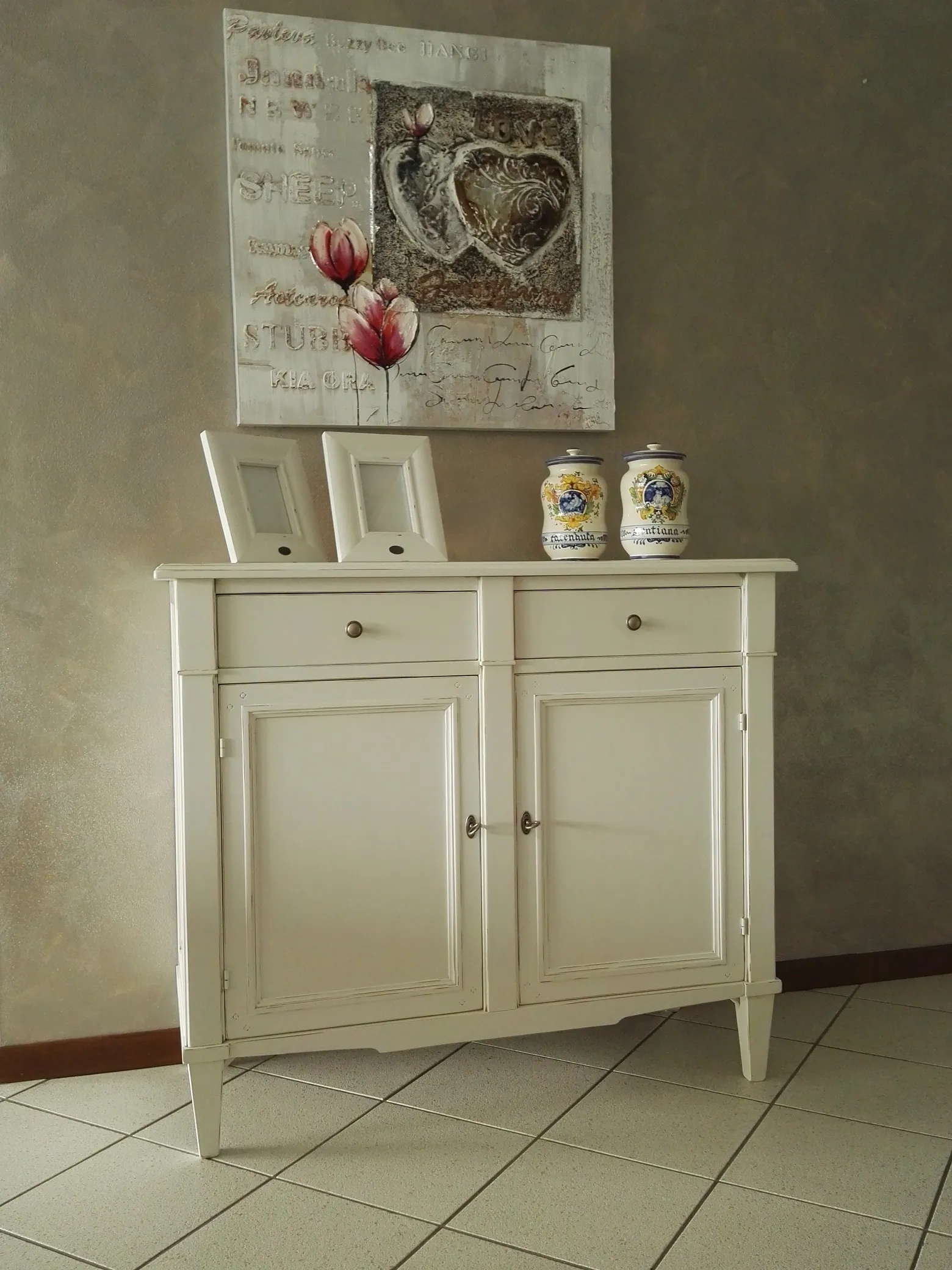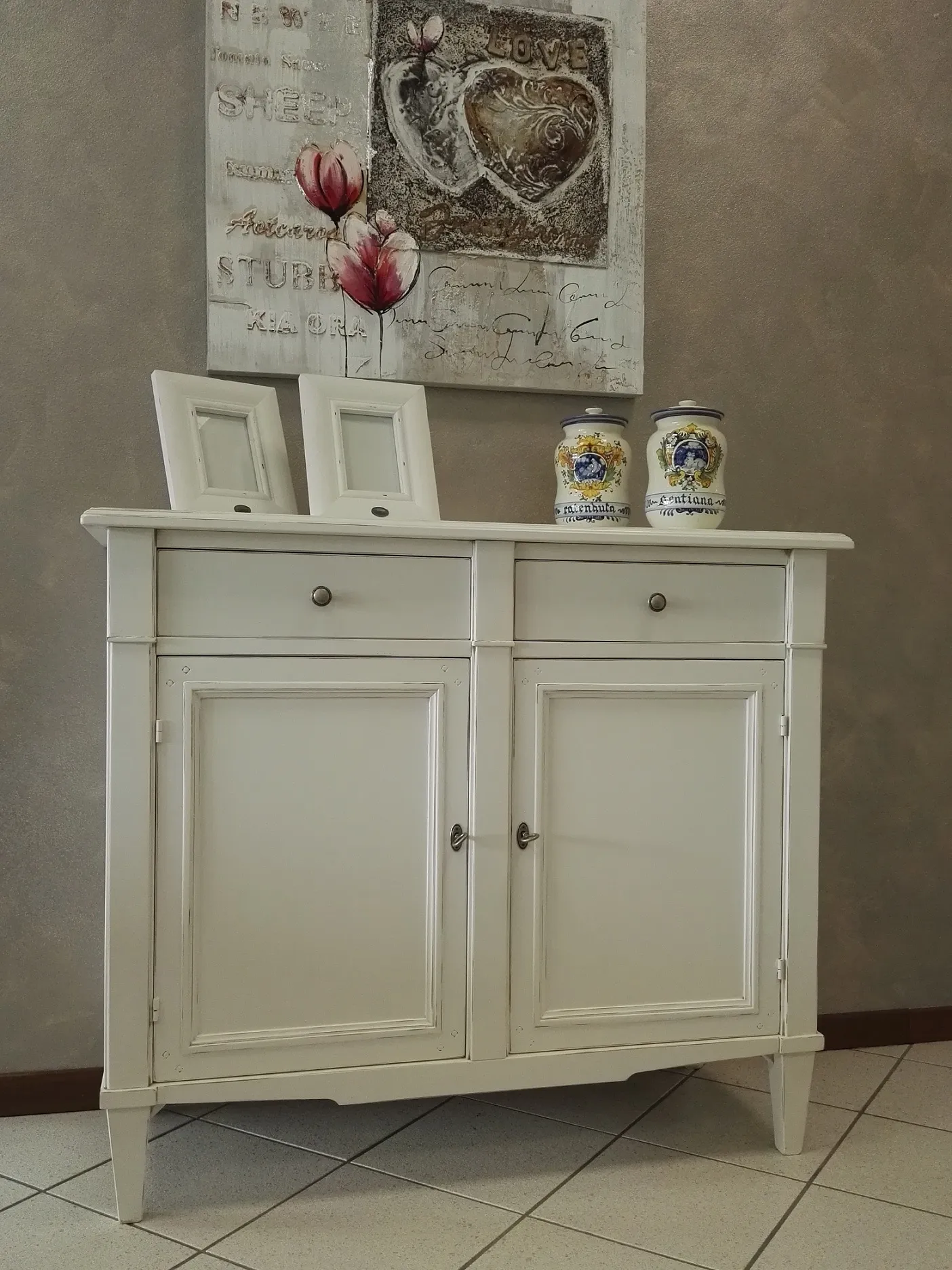 Credenzino classico in legno massiccio laccato opaco spigolato shabby bianco con 2 porte e 2 cassetti, cm 116x48x110 h. Questo articolo nato dalla lavorazione artigianale è adatto per ogni ambiente: sala e ingresso, anche per la sua profondità ridotta. La Finitura shabby leggermente spigolata lo rende adatto a tutti gli abbinamenti, anche con mobili in noce. L'interno del mobile è in legno massello laccato spigolato come l'esterno