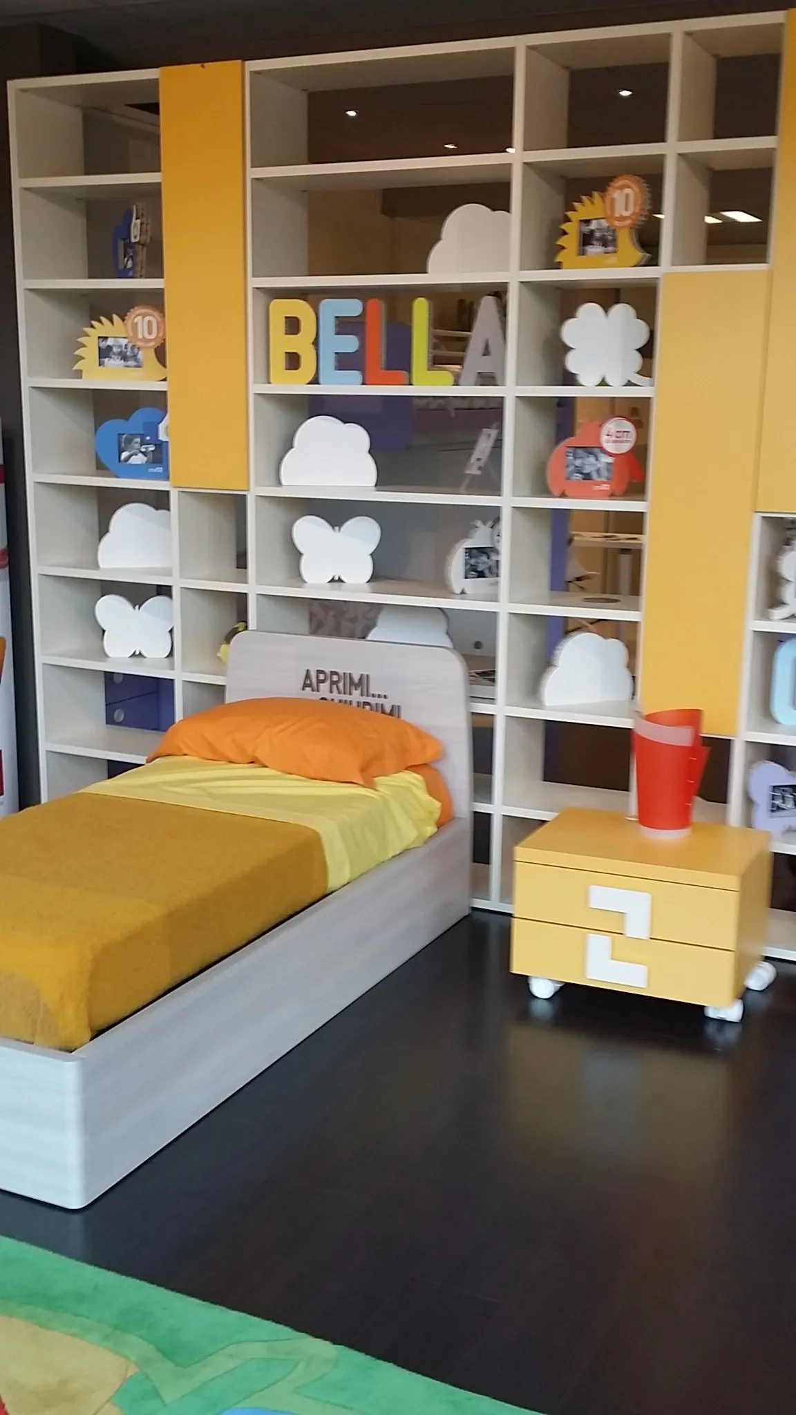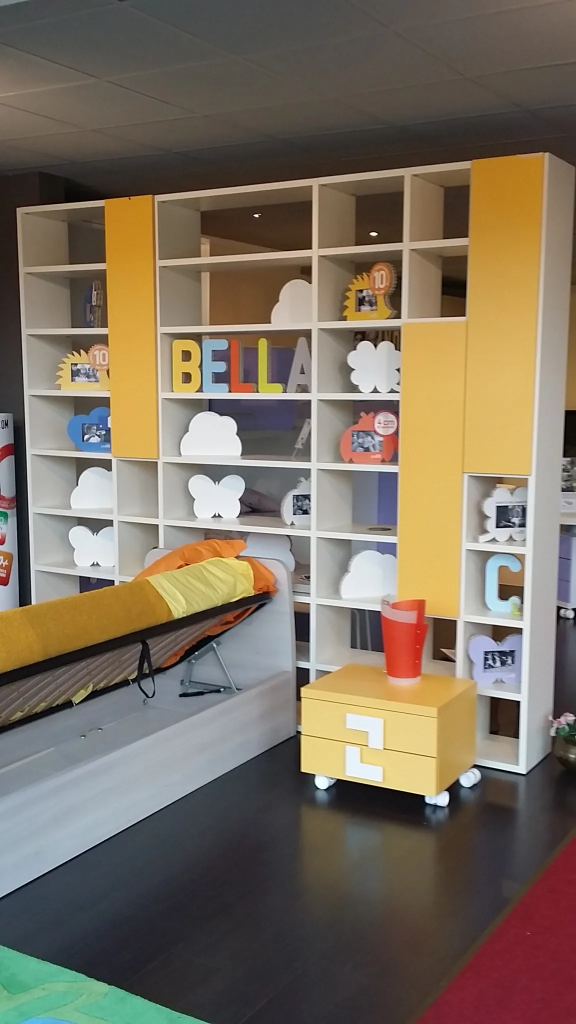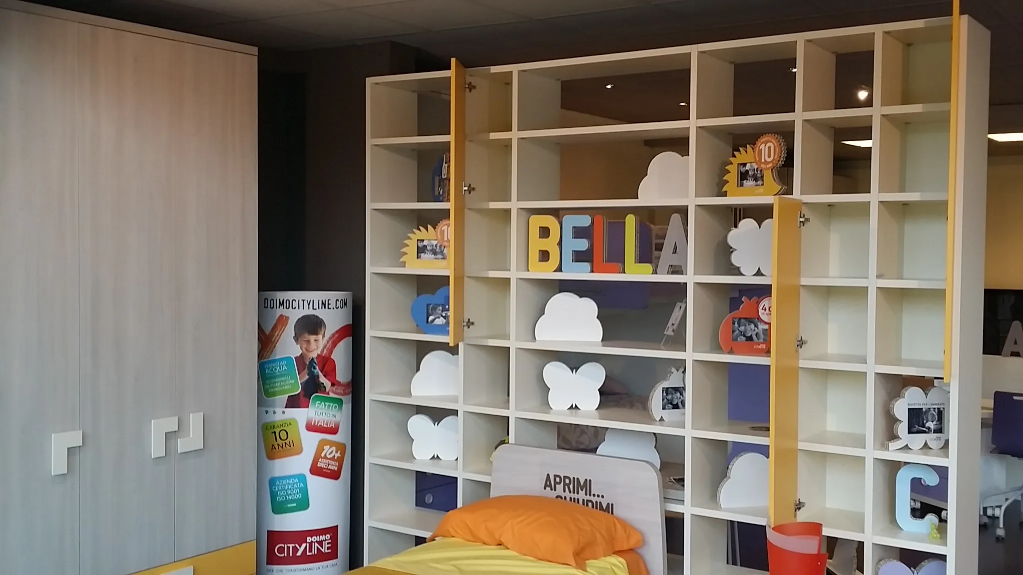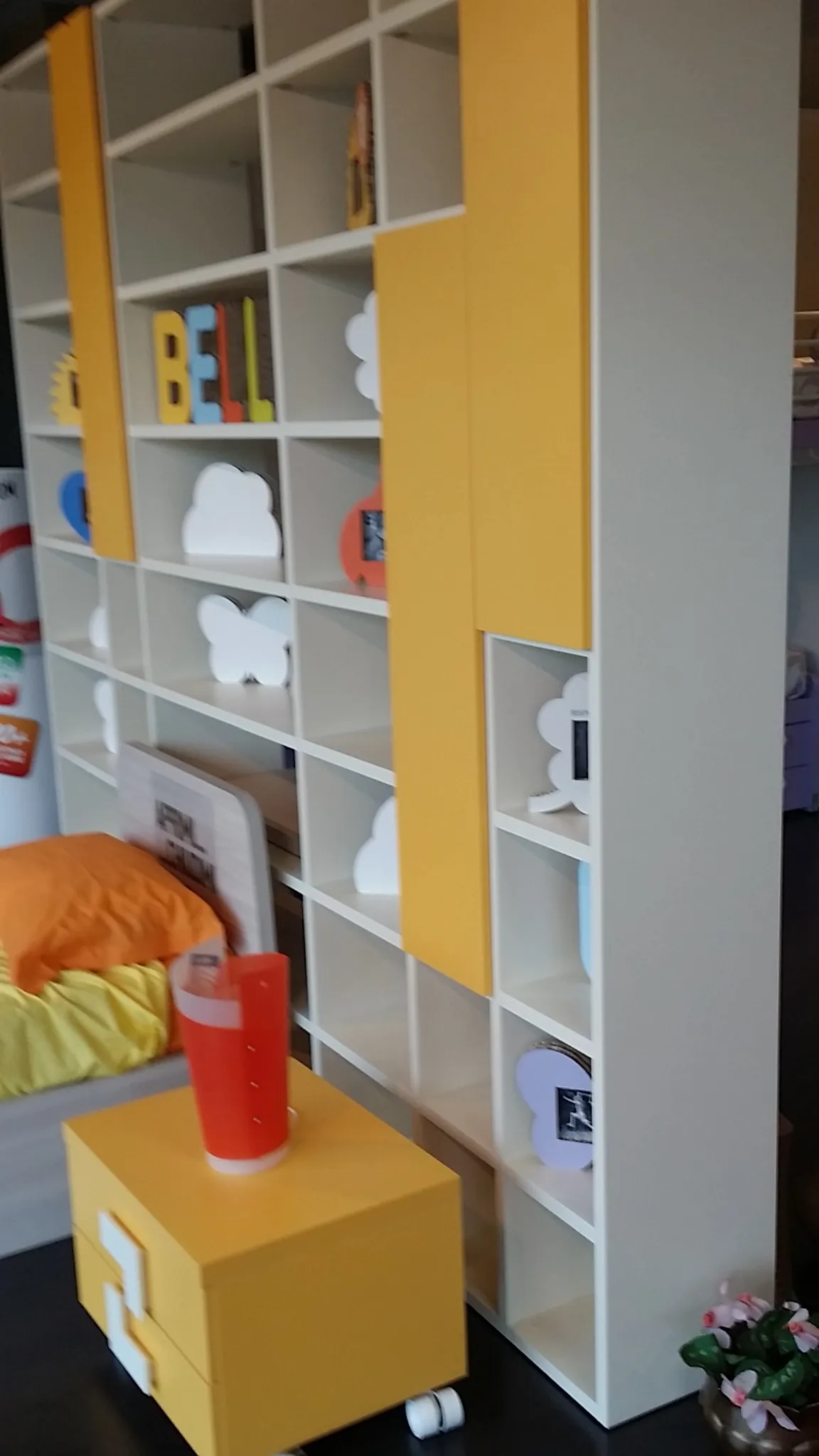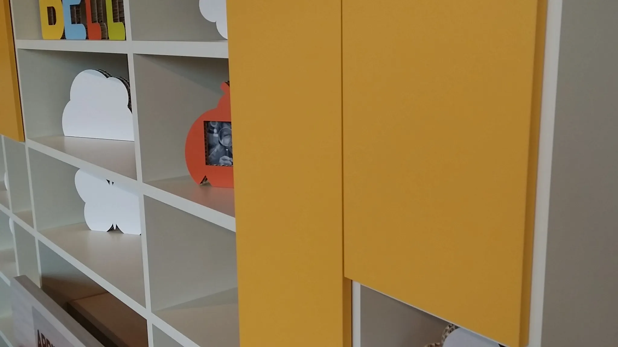 Libreria bifacciale posizionabile in centro stanza oppure a parete, finitura magnolia con ante battenti colore zafferano, ripiani con aggancio a baionetta, cm. 288x36prof.x258h.