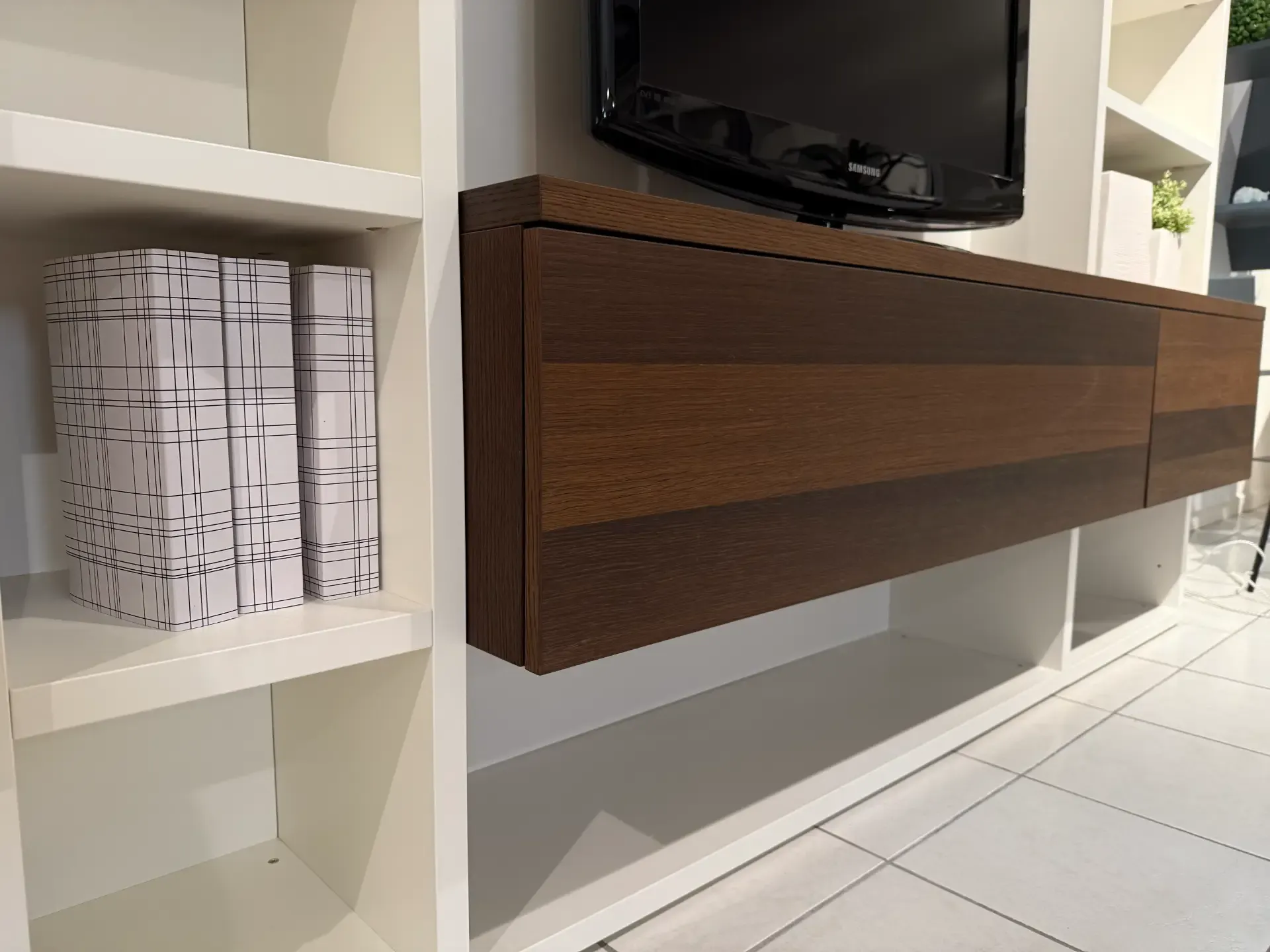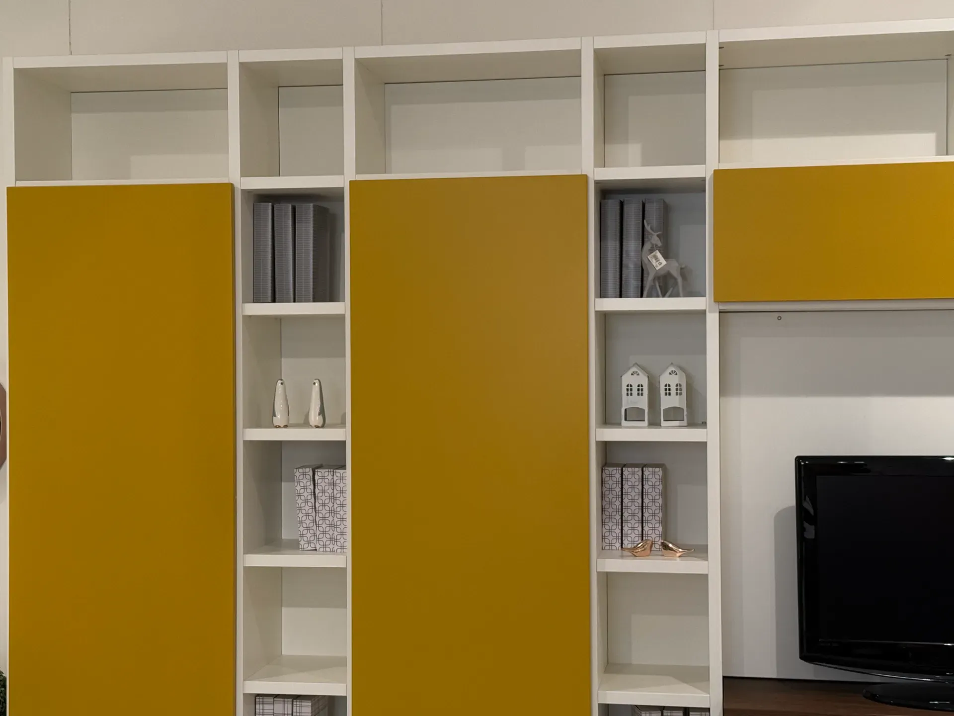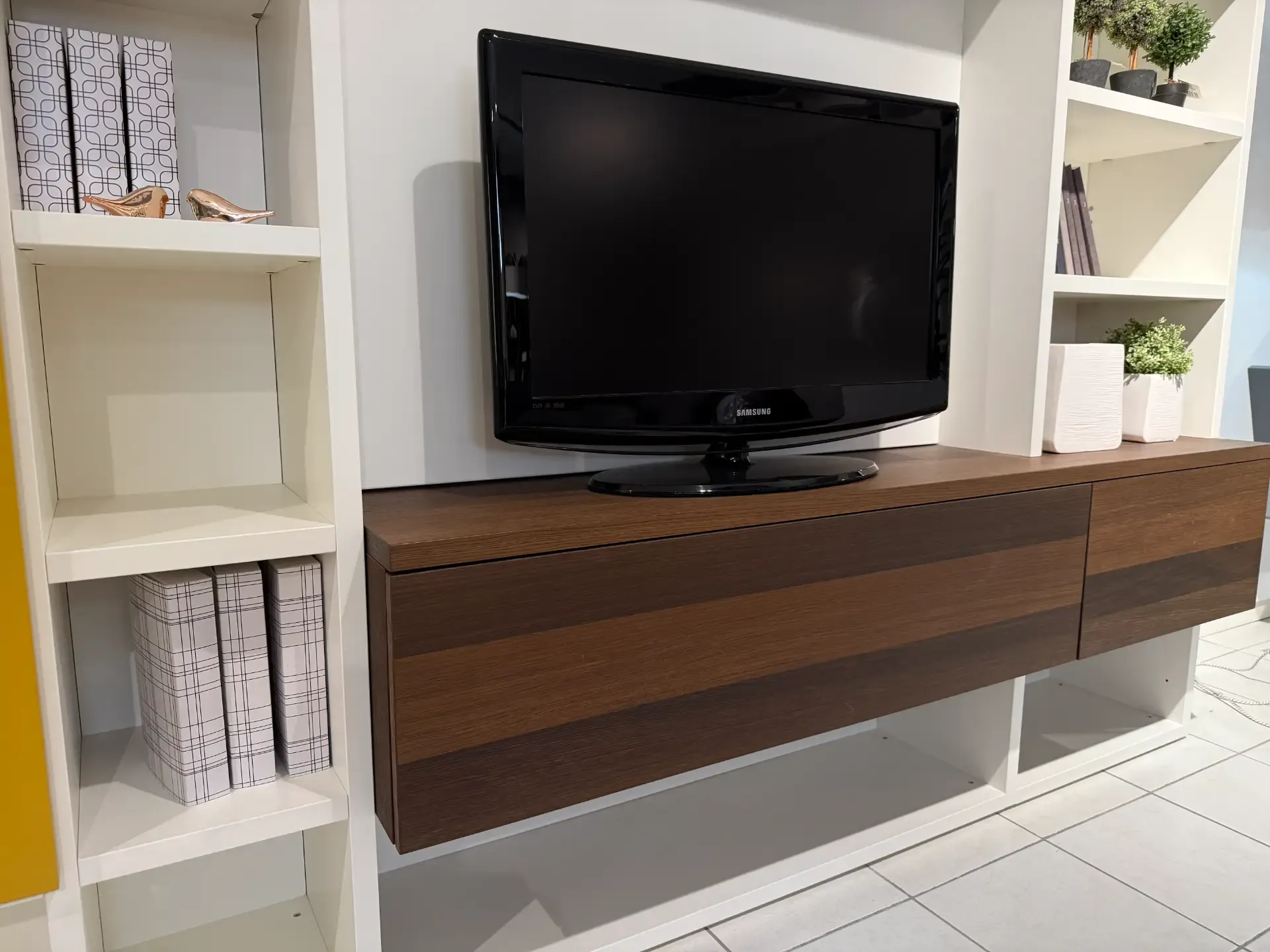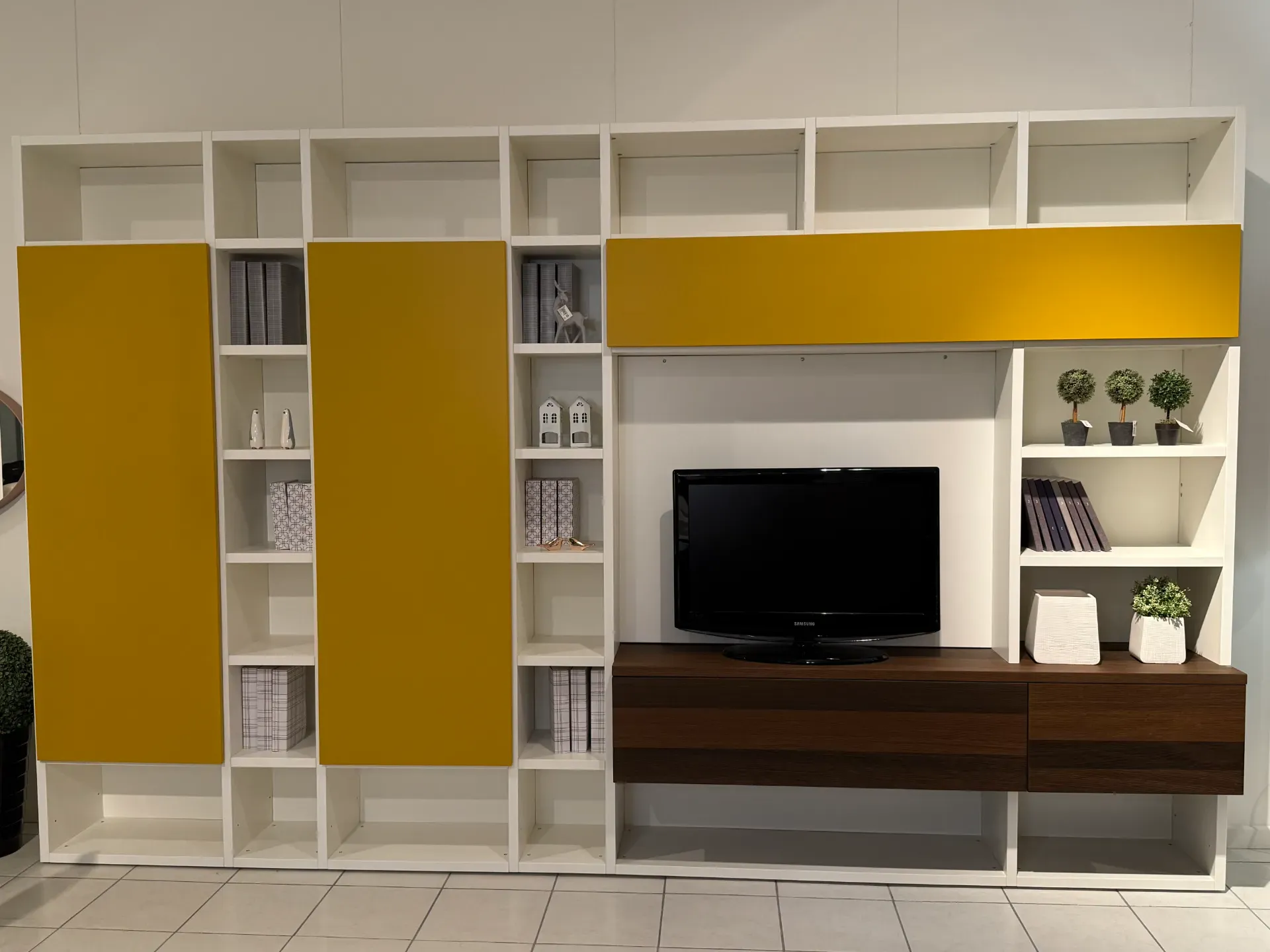 Parete soggiorno libreria in versione laccato opaco bianco e impiallacciato rovere therm. Ante laccato color senape. Predisposto con vano per la tv. Lunghezza cm 360 x 228 H x 46,9/32 profondo.