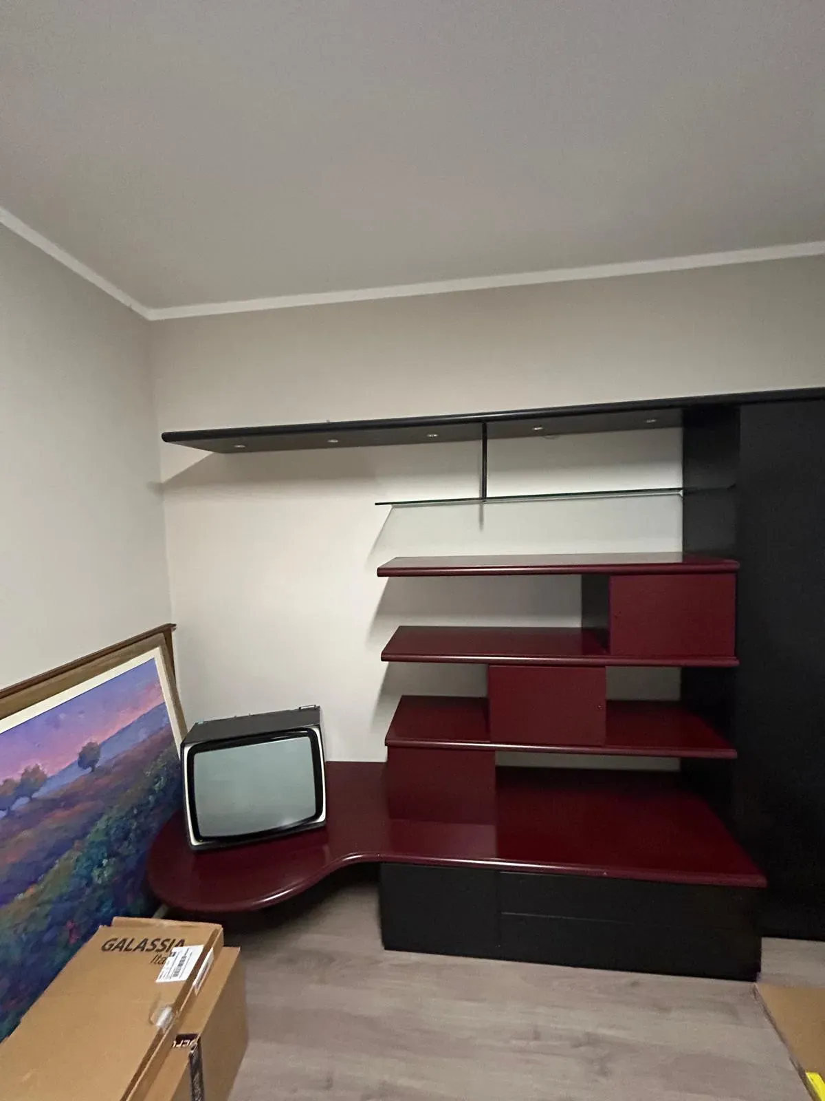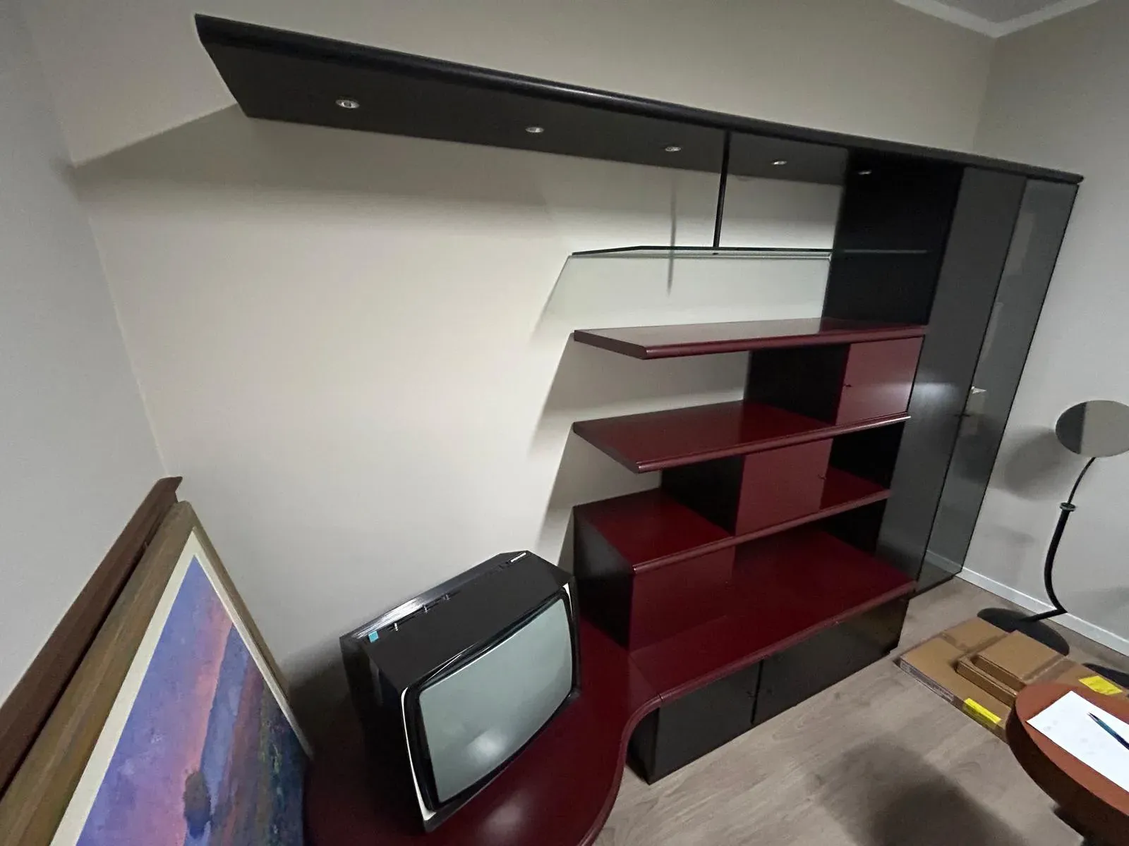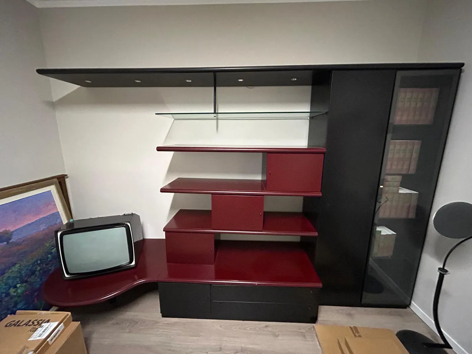 Parete soggiorno linea prestigio lunga cm.315\320 circa, laccata opaca nera//bordeaux completa di mensolone con faretti, penisola sagomata porta Tv, vetrinetta, vani contenitivi, cassetti e cestoni ripiani in vetro e legno.
