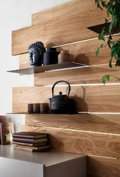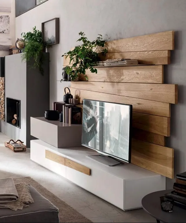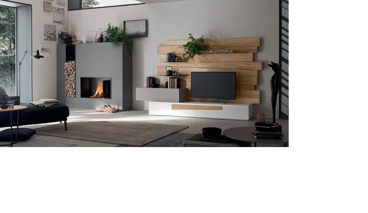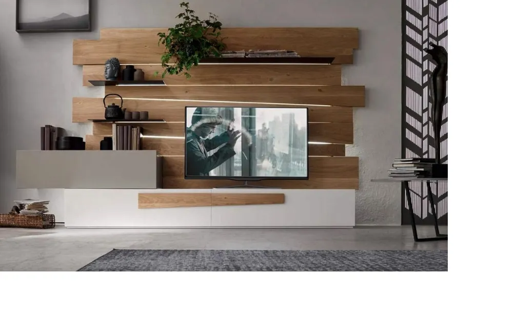 Parete dalle finiture estetiche e contemporanee che danno personalità all'ambiente. La finitura del vero legno rovere naturale abbinata al laccato bianco e all'elemento laccato Agata opaco, la mensola in metallo metal grey" rendono questa parete moderna e adatta ad ambienti caldi e raffinati. L'originale schienale realizzato dalle doghe in vero legno materico e dalle forme irregolari fanno da sfondo al televisore. Le mensole in metallo sono un ulteriore appoggio per i vostri oggetti preferiti. I cassetti hanno guide blumotion con rientro ammortizzato. La parete ha le seguenti misure: l. 269.5 p 50/62.7 h 161.6,7 Il prezzo si riferisce alla composizione come foto esclusa di luci. . Maggioraxione per luci al led complete di telecomando € 280,00.