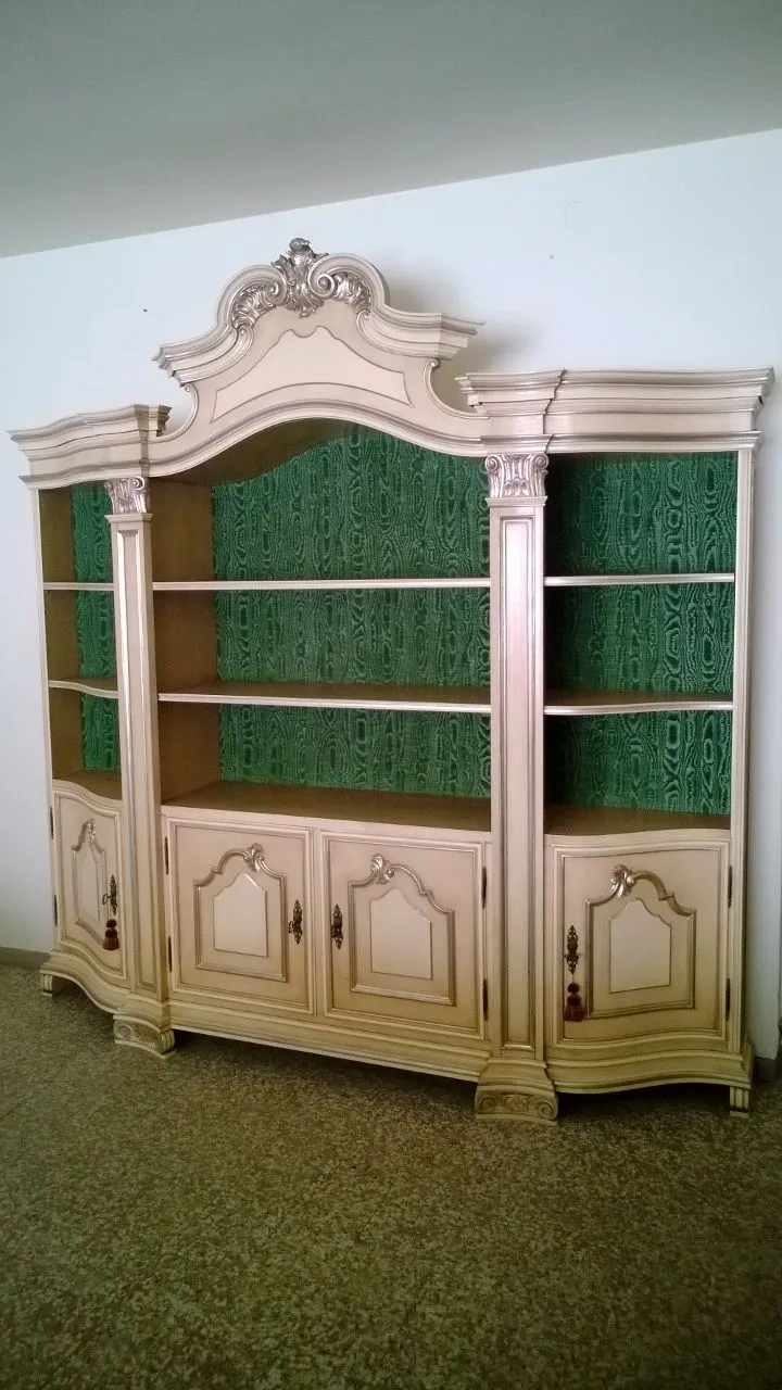 Libreria soggiorno Carpanelli in legno laccato patinato bicolore tinta avorio beige con particolari in foglia argento. Cimasa, piedi e capitelli intagliati in legno massello finitura foglia argento. Schienale in velluto verde. Quattro ante base di cui n. 2 sagomate ad esse. Stile 700° veneziano dim. cm. 280 h. cm. 240