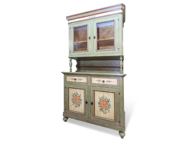 Si tratta di una cristalliera con decorazione in stile toscano, dipinta a mano, che richiama l'eleganza e la tradizione dei mobili artigianali italiani.