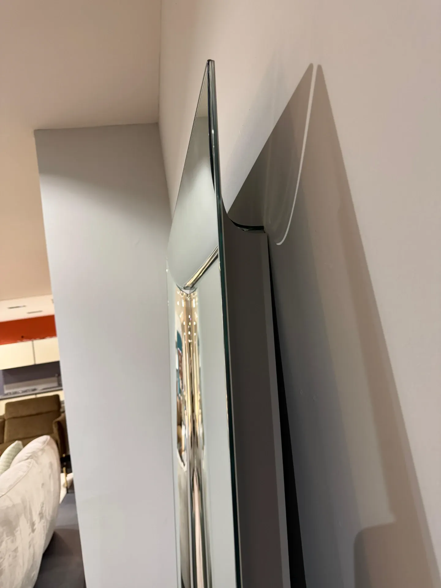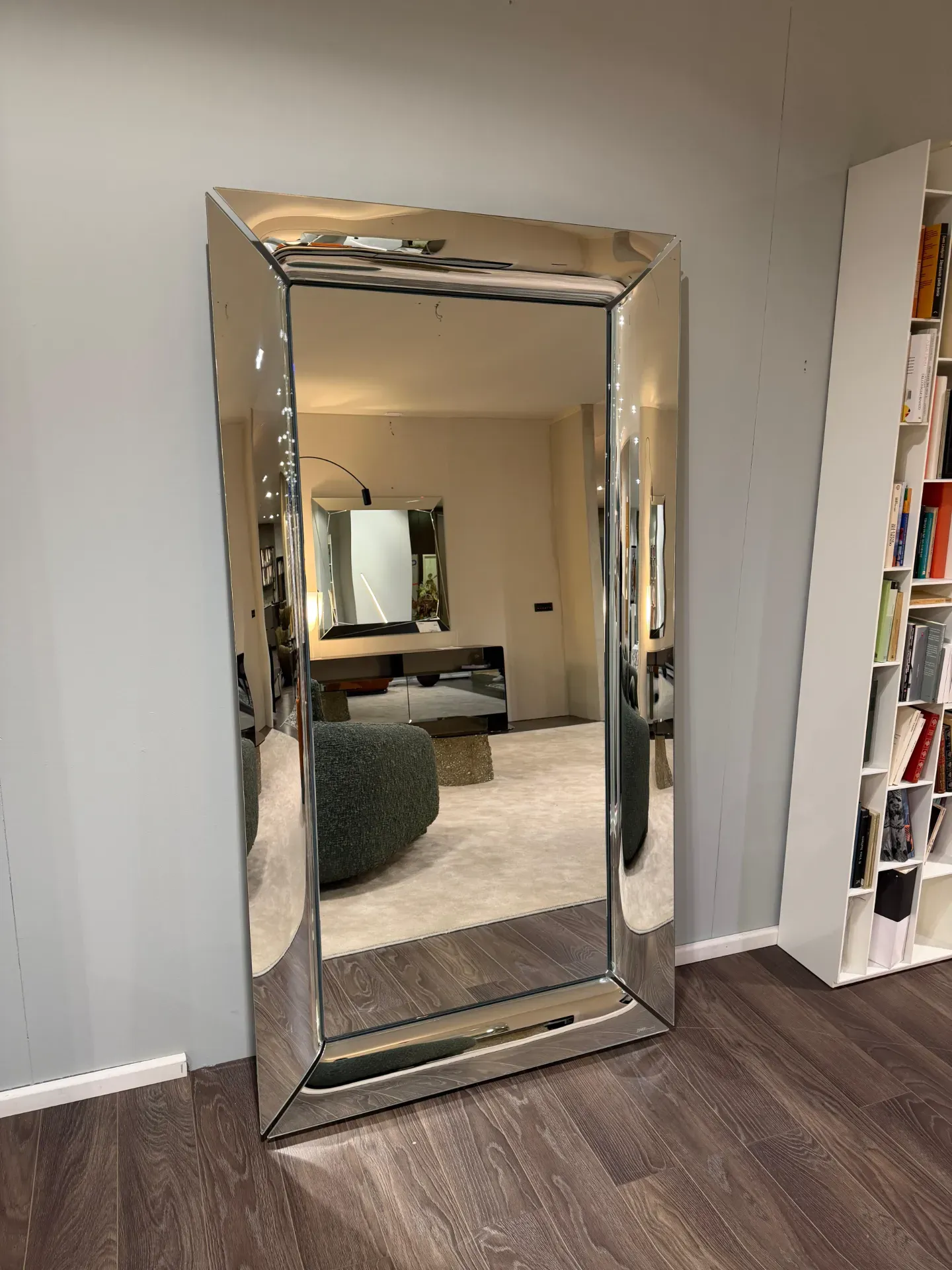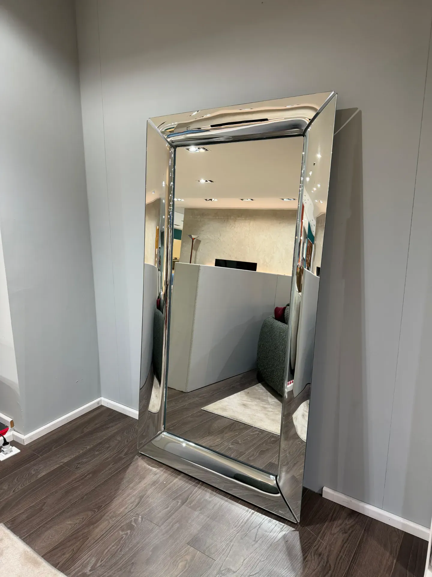 Specchio Caadre di FIAM: cornice in vetro curvato retro-argentato, eleganza minimal e raffinata appendibile a parete o da terra. In offerta outlet.