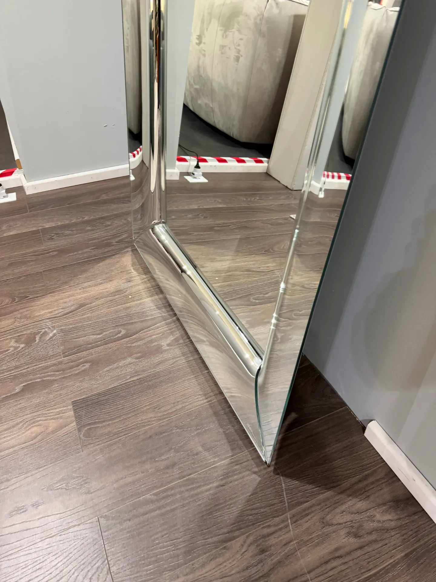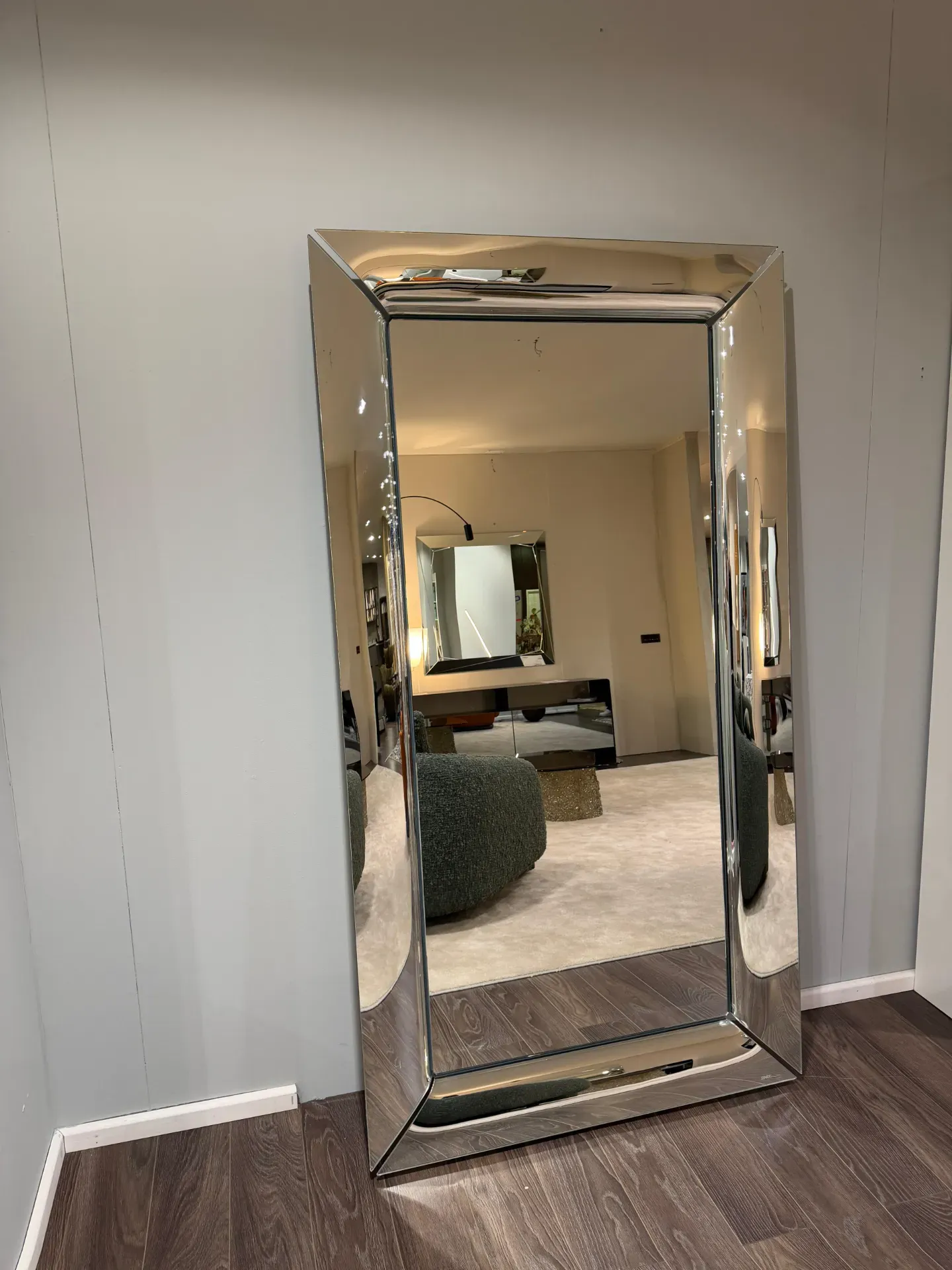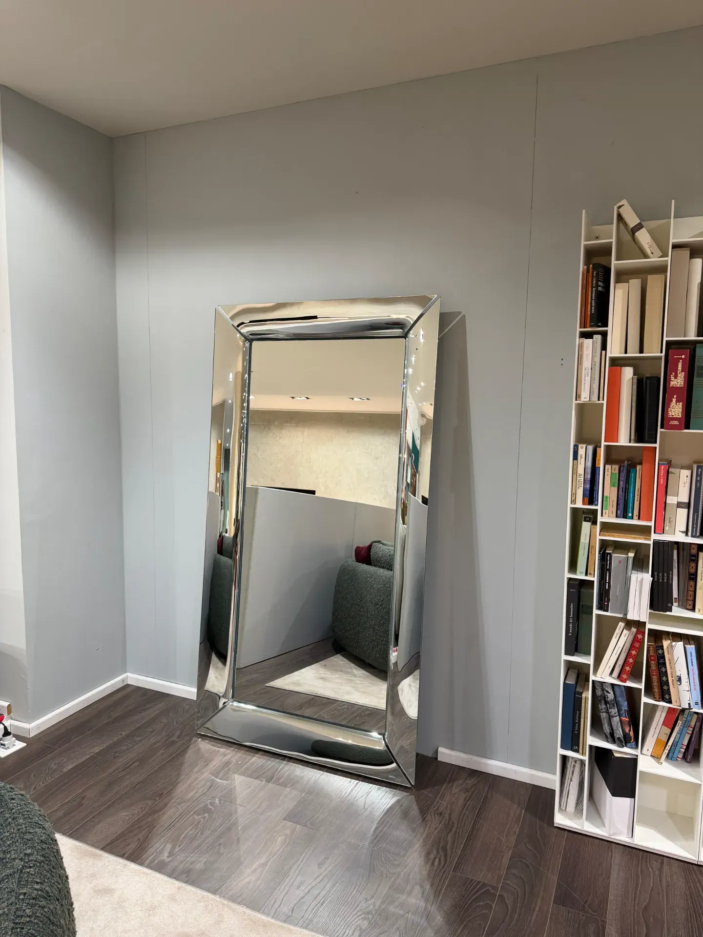 Specchio Caadre di FIAM: cornice in vetro curvato retro-argentato, eleganza minimal e raffinata appendibile a parete o da terra. In offerta outlet.
