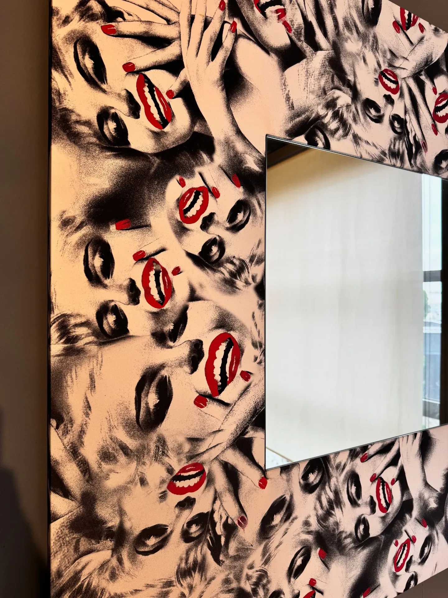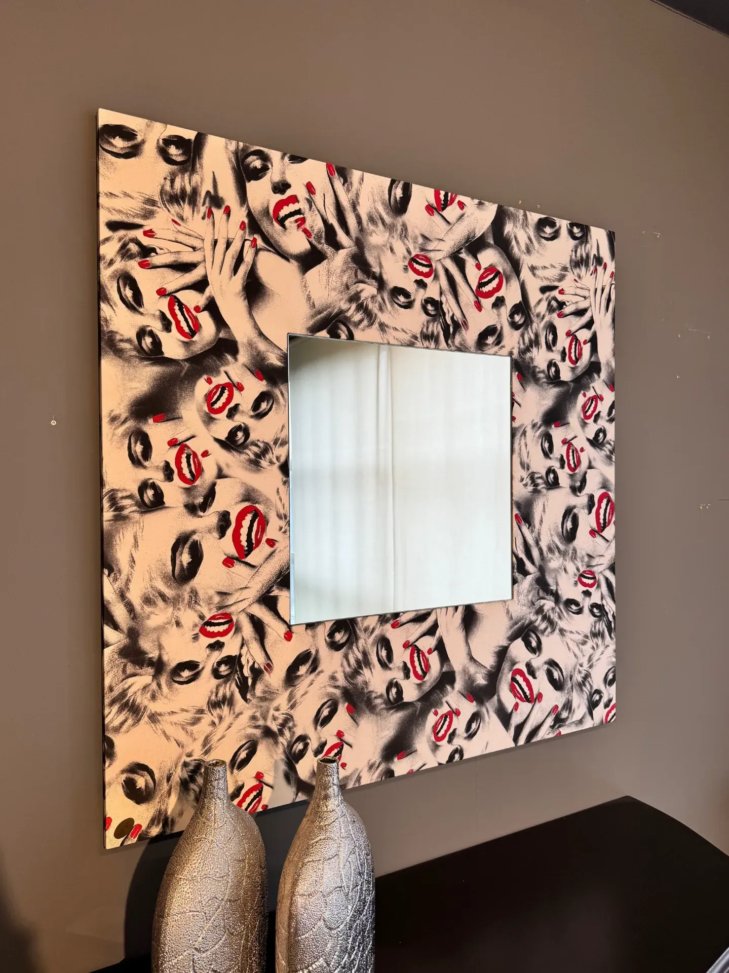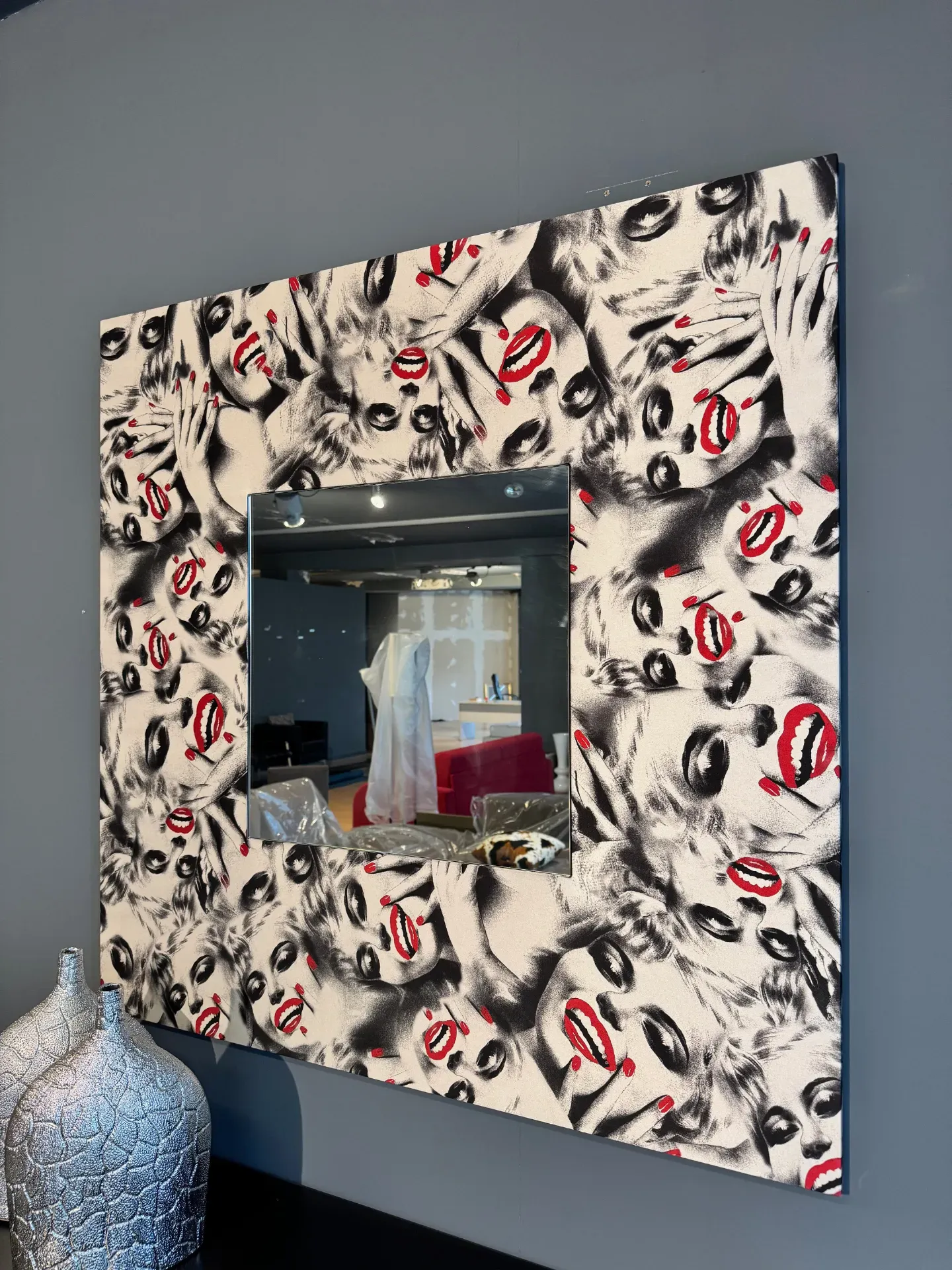 Specchiera artigianale con cornice in seta, scontata a 400,00 euro. Specchiera quadrata con cornice perimetrale in seta con raffigurato Marilyn Monroe in bianco e nero con dei dettagli in rosso. Dimensioni cornice: larghezza 110, altezza 110 centimetri. Dimensioni specchio: larghezza 50, altezza 50 centimetri. Prodotto che potrete vedere in esposizione a Paina di Giussano, in provincia di Monza e Brianza. Per qualsiasi informazione non esitate a contattarci.