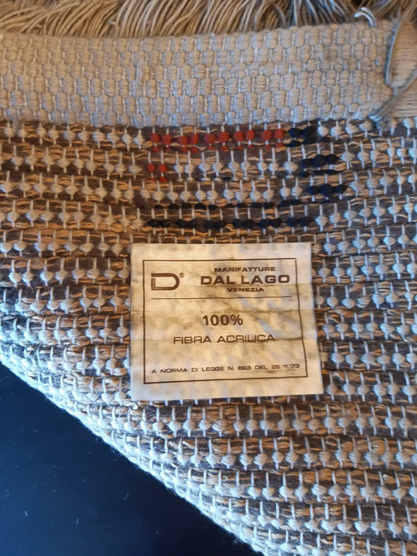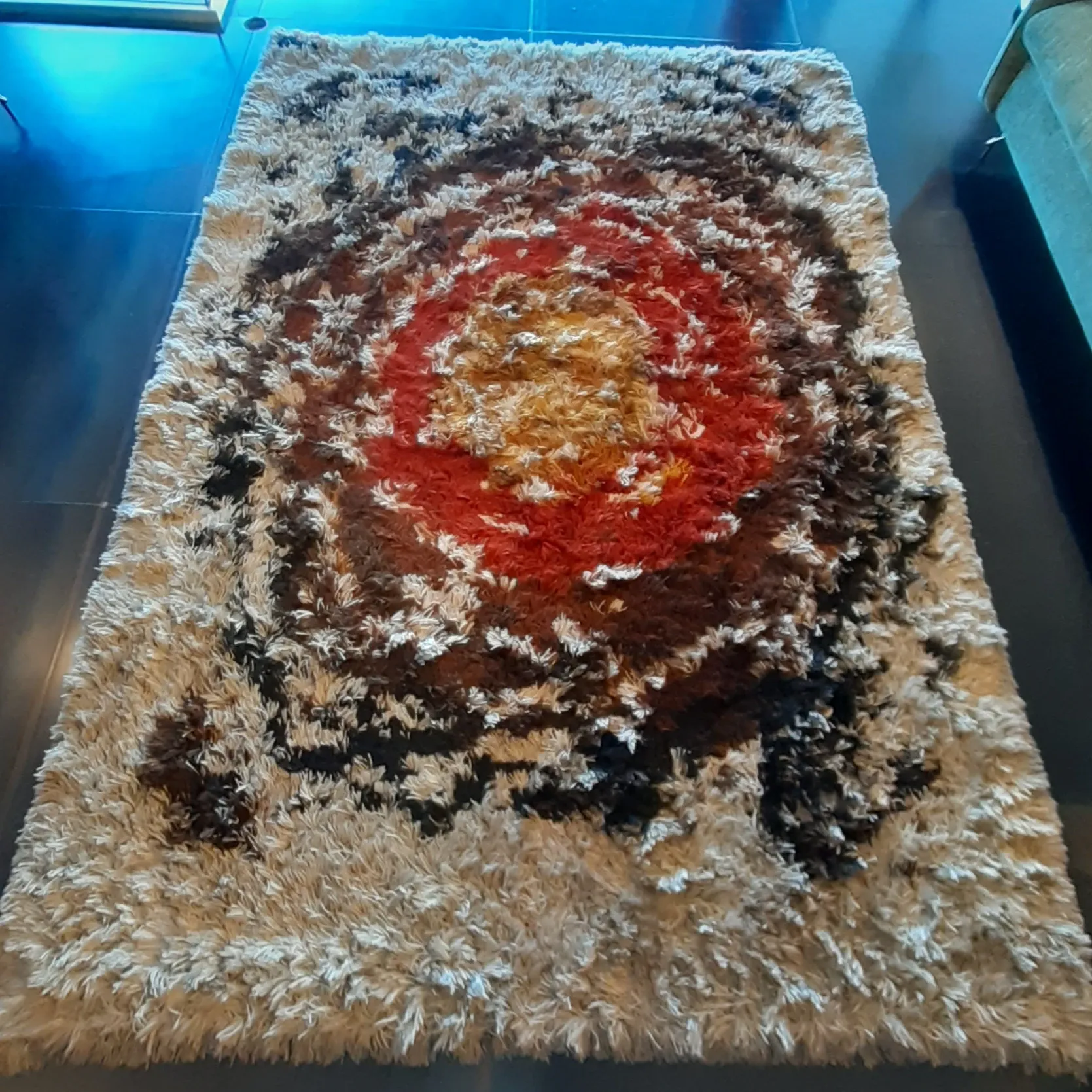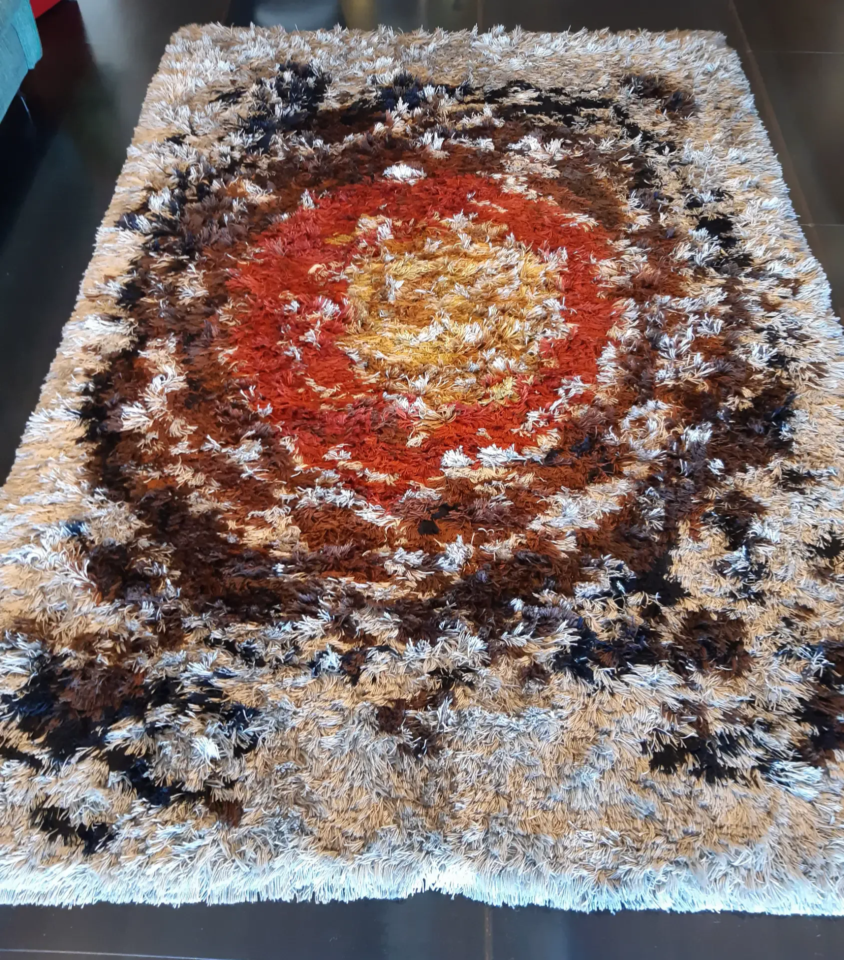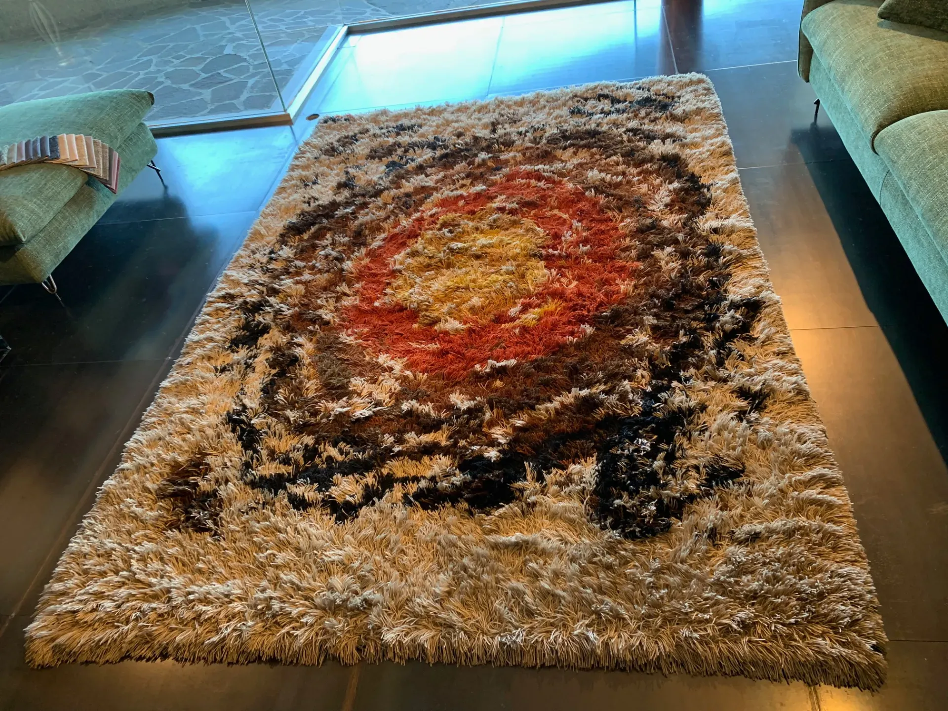 Tappeto vintage anni 70 Dal Lago di Venezia cm. 200 X 300 Manifattura italiana Azienda nota per la manifattura di tappeti attiva negli anni 70 Famosa per i suoi tappeti a pelo lungo con fantasie astratte in stile Pollock Decoro informale a base col.grigio con pennellate marrone , arancione e ocra .