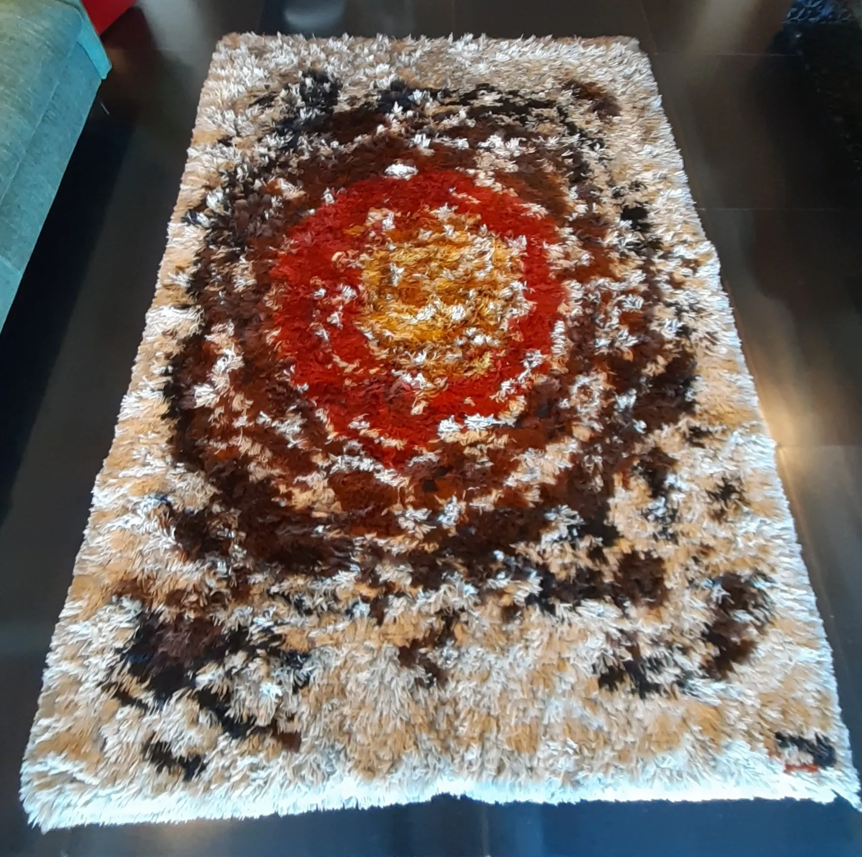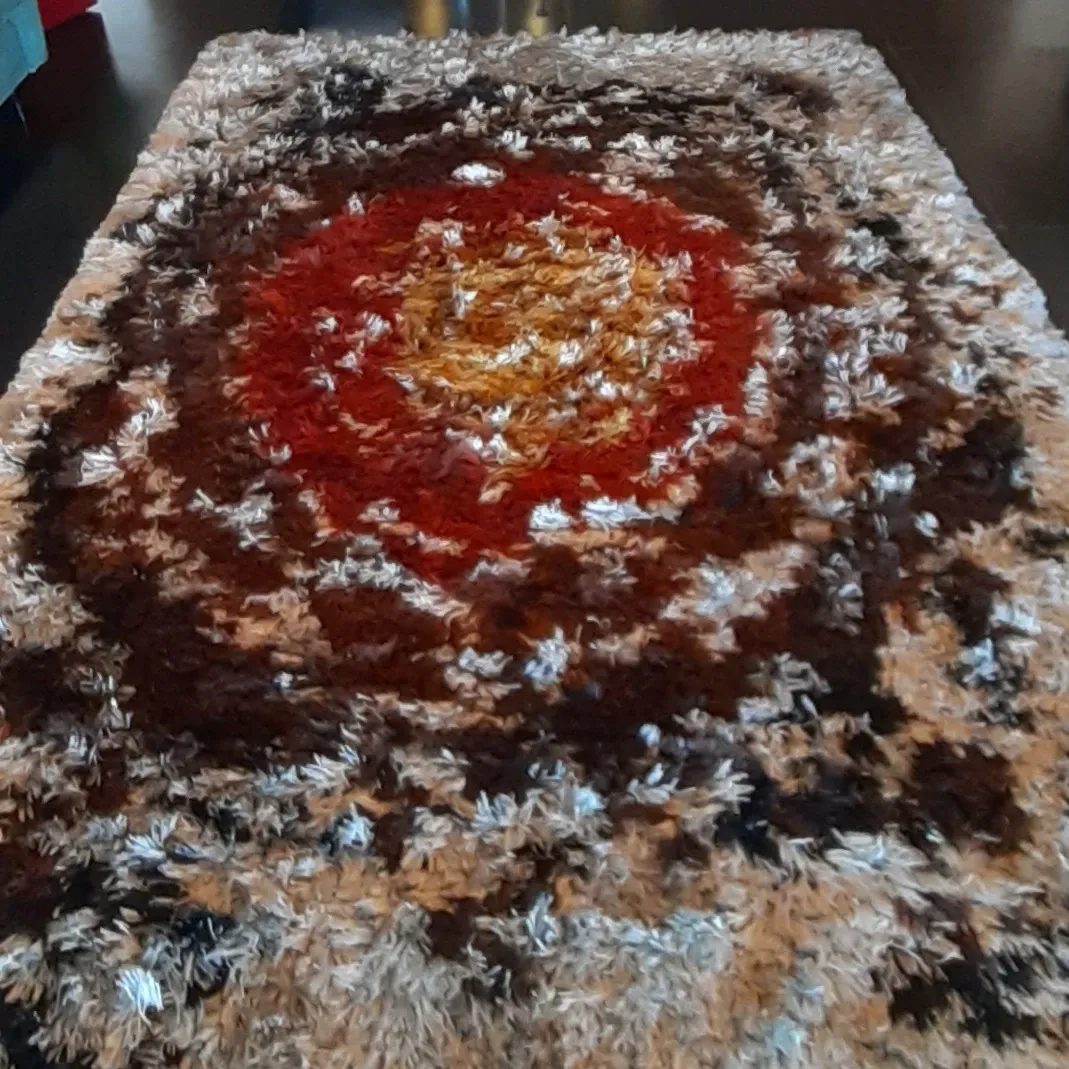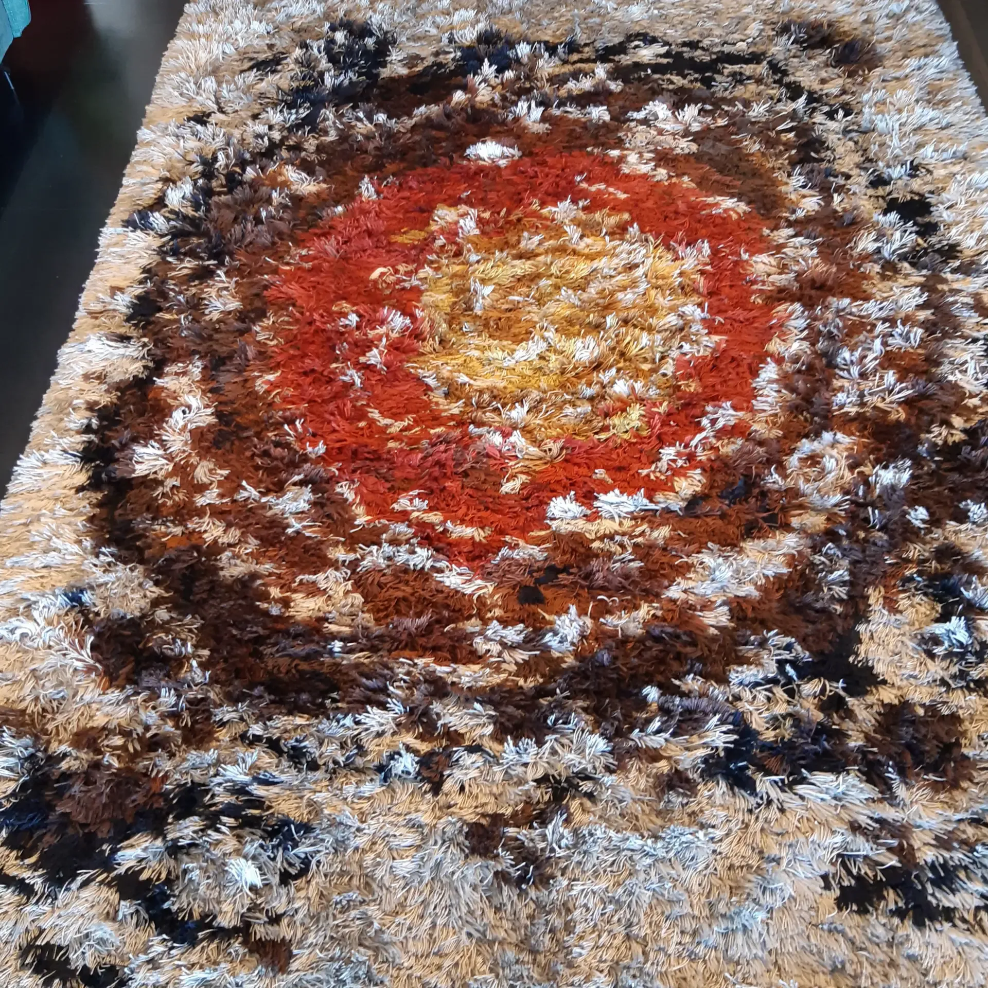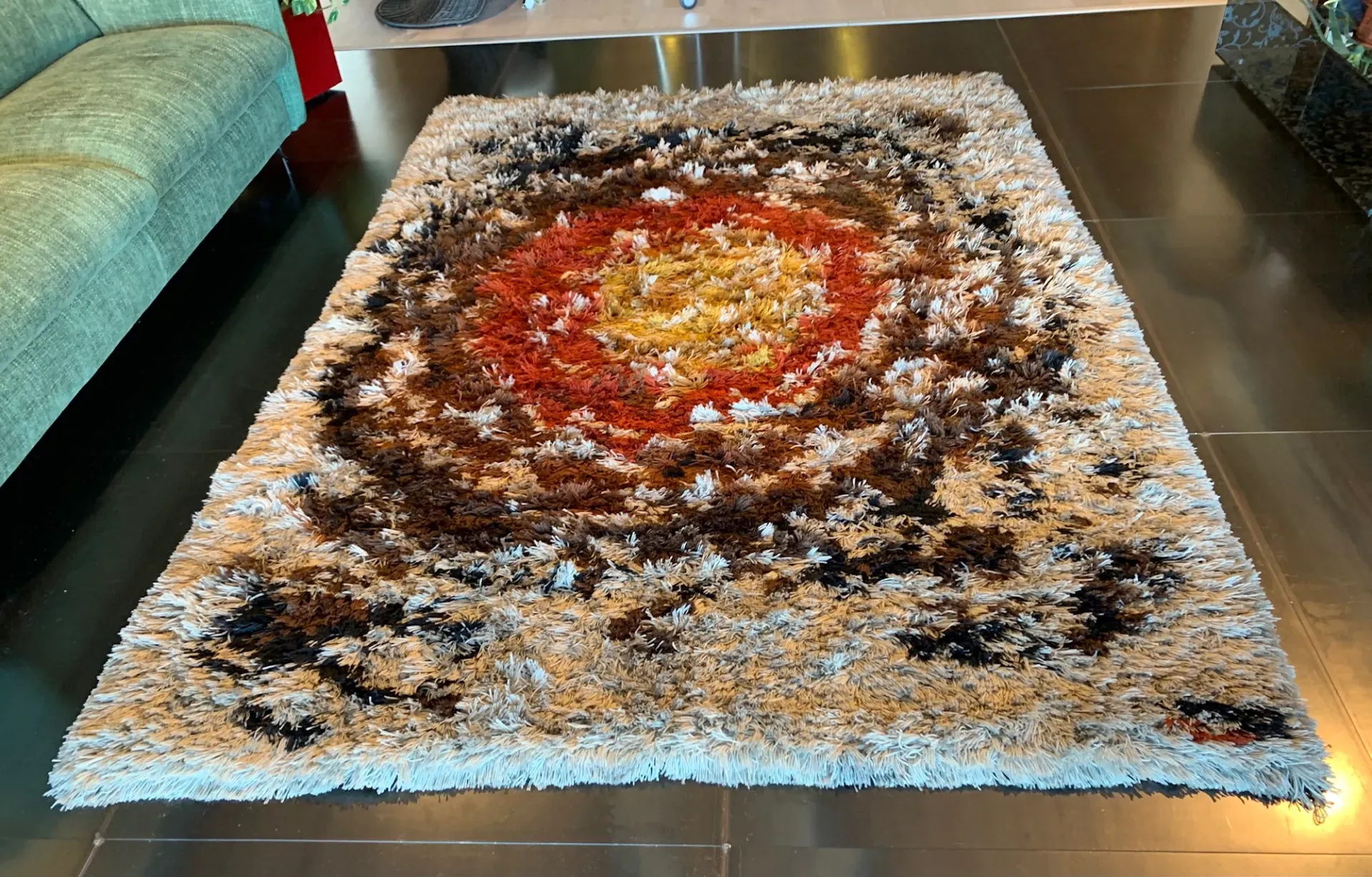 Tappeto vintage anni 70 Dal Lago di Venezia cm. 200 X 300 Manifattura italiana Azienda nota per la manifattura di tappeti attiva negli anni 70 Famosa per i suoi tappeti a pelo lungo con fantasie astratte in stile Pollock Decoro informale a base col.grigio con pennellate marrone , arancione e ocra .