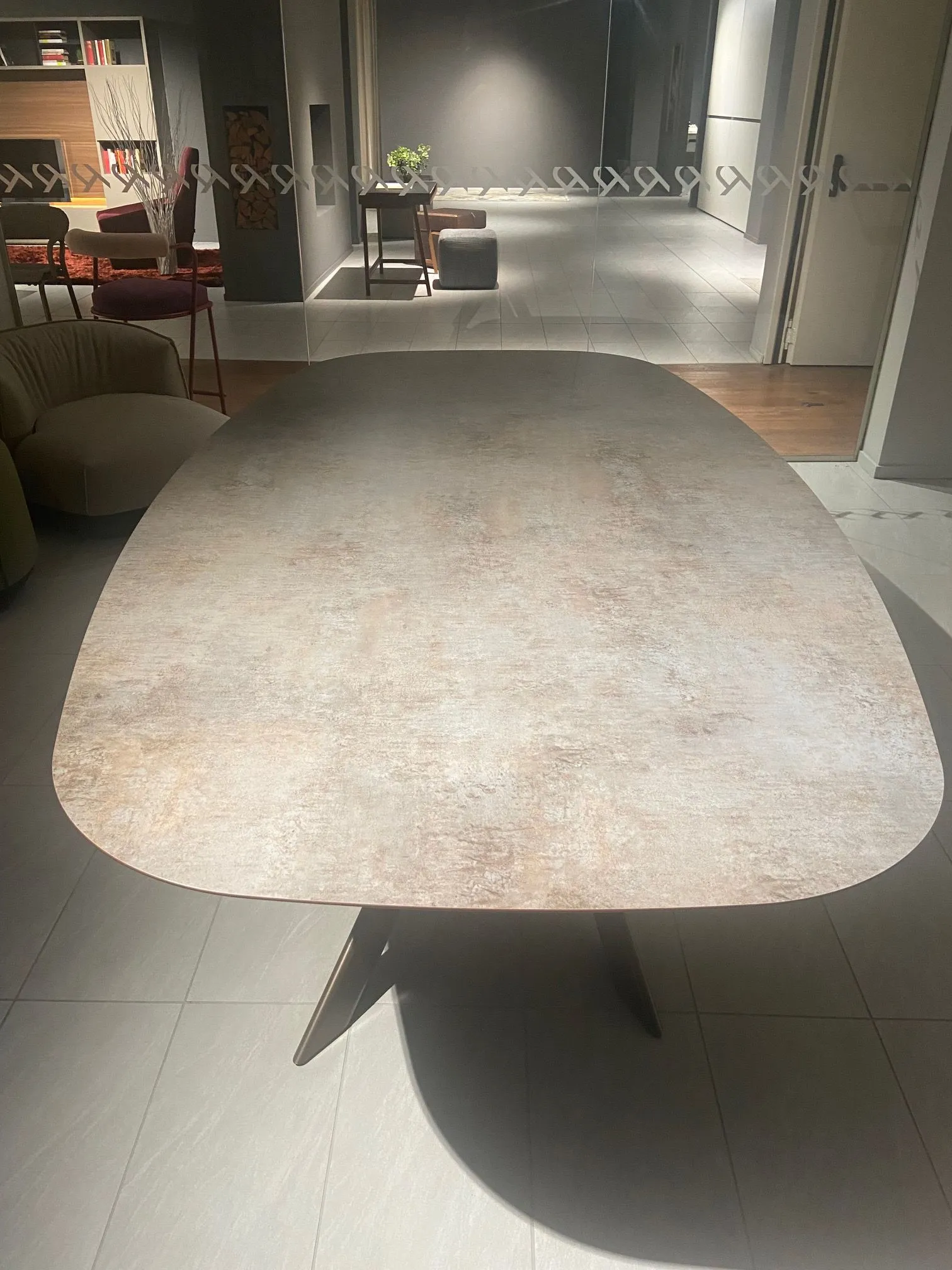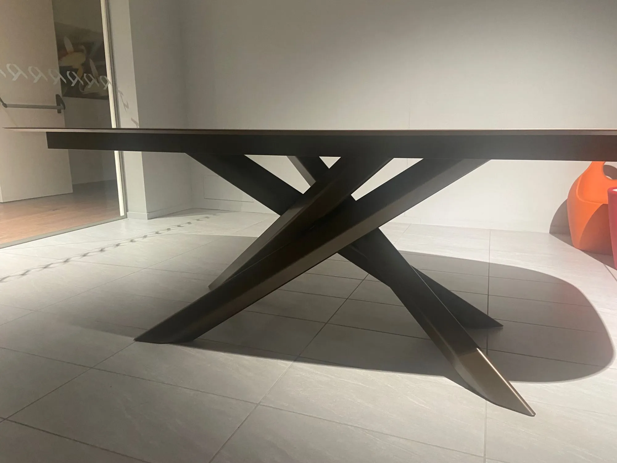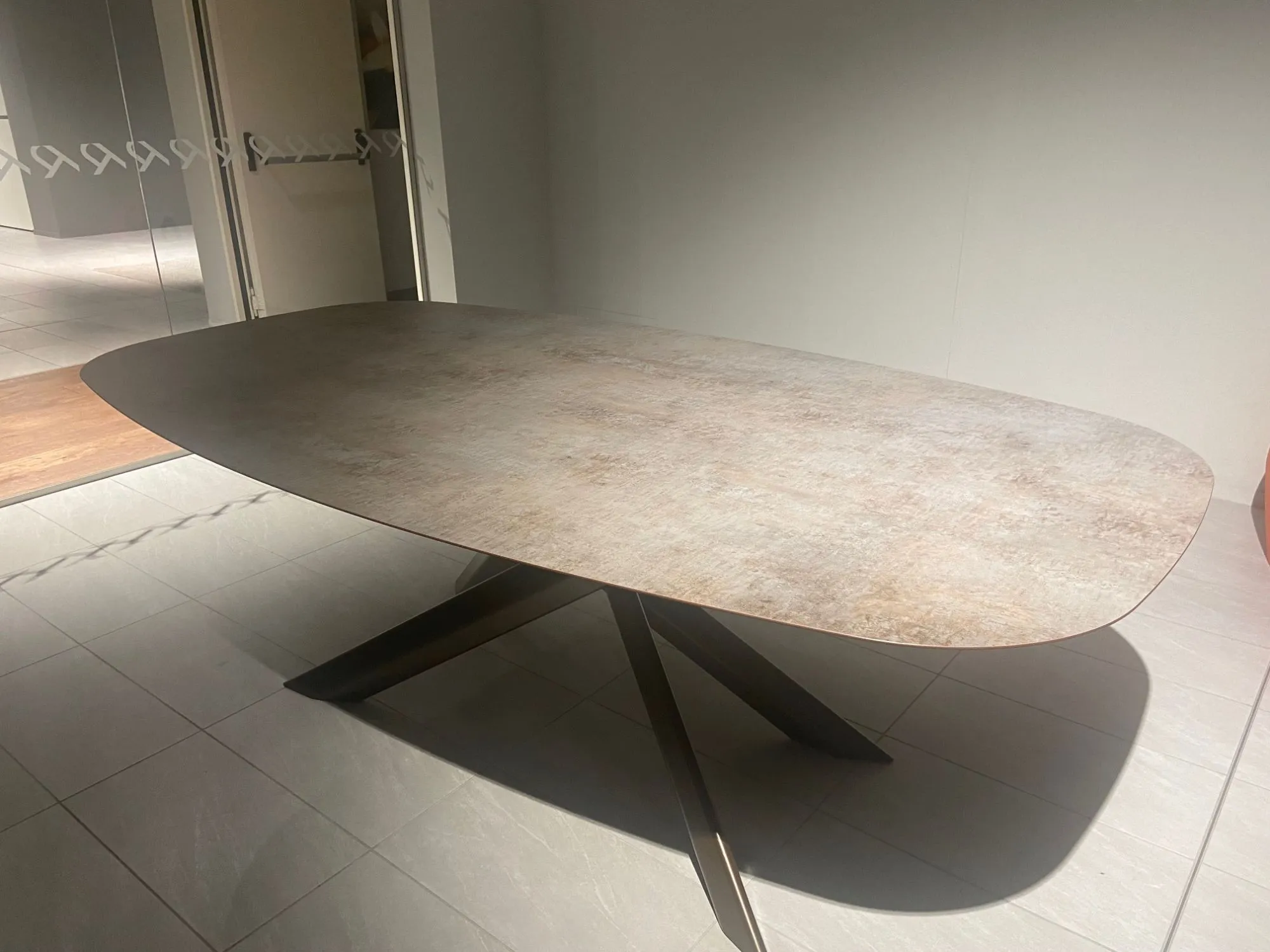 Tavolo Varaschin modello System Star.Struttura bronzo e piano in HPL Bedonia.Misura cm. 220x120 forma ellittica.