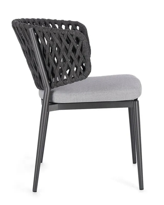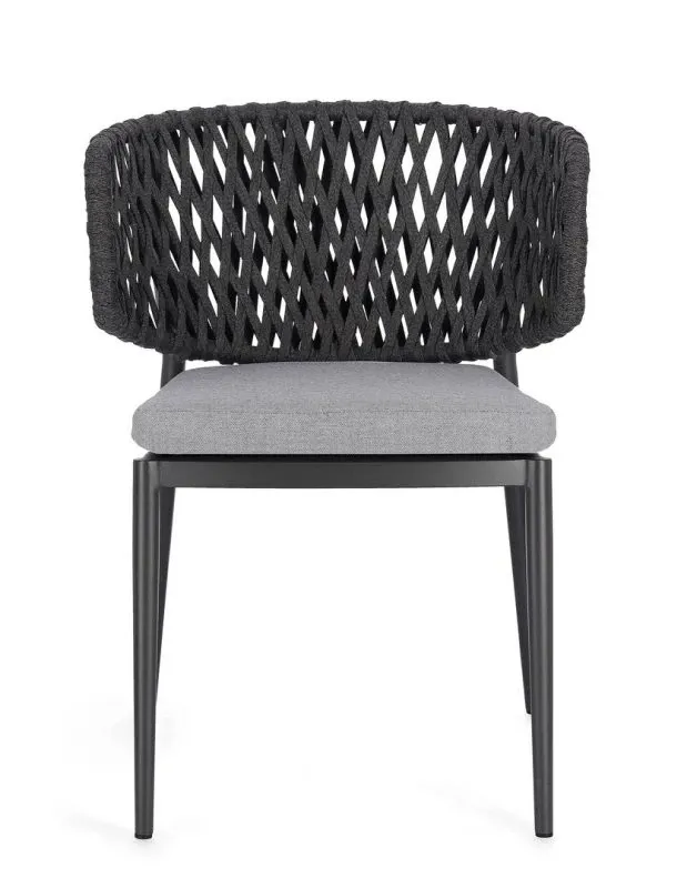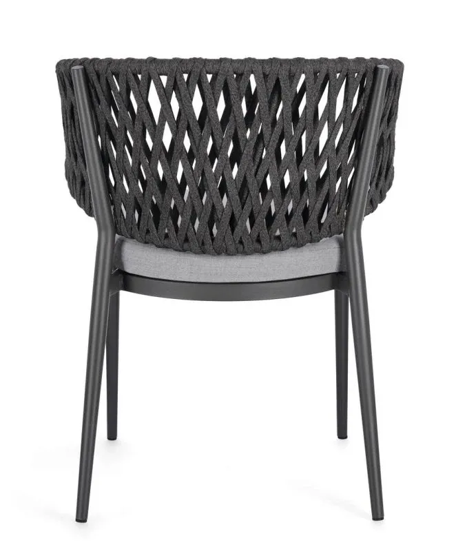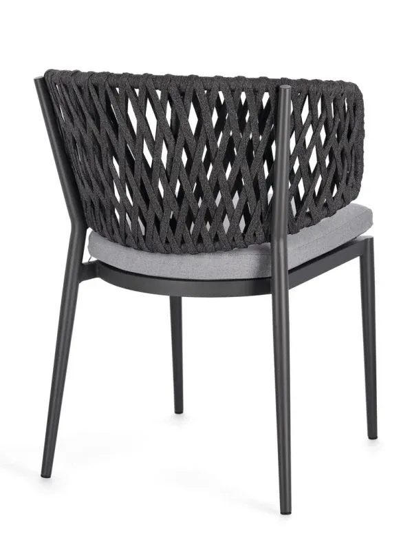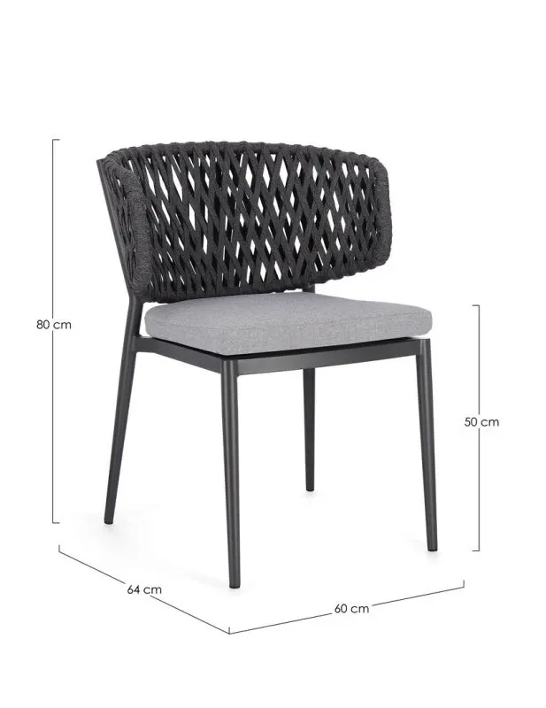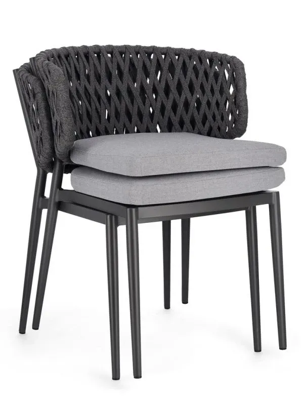 STRUTTURA IN ALLUMINIO VERNICIATO A POLVERE (POLIESTERE). INTRECCIO CON CORDE IN TETORON (100% POLIESTERE). CUSCINO SEDUTA SFODERABILE IN TESSUTO IDROREPELLENTE ACRILICO. IMPILABILE.
