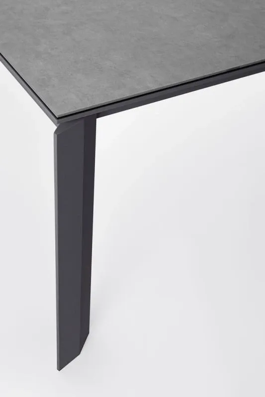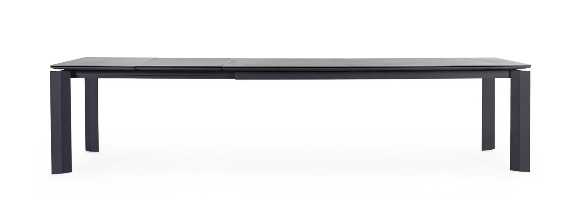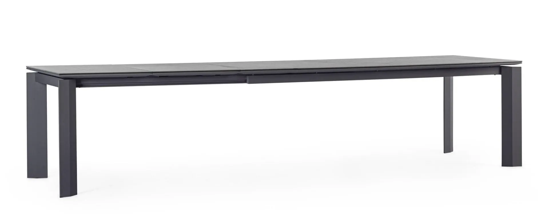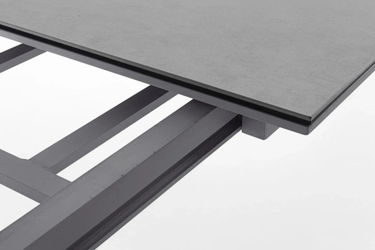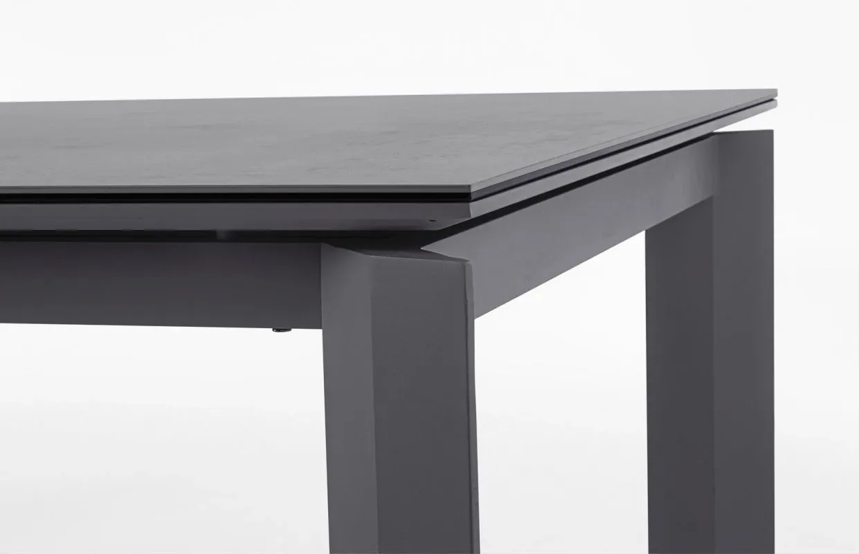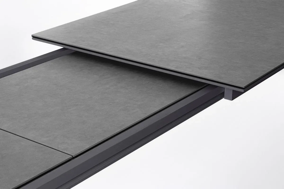 STRUTTURA IN ALLUMINIO VERNICIATO A POLVERE (POLIESTERE). PIANO IN CERAMICA (CON BASE IN VETRO) SPESSORE TOTALE 9MM. ALLUNGABILE CON APERTURA TELESCOPICA. PROLUNGHE ESTERNE CON ALLOGGIO SOTTO IL PIANO. VITERIA IN ACCIAIO INOSSIDABILE. GAMBE DA ASSEMBLARE.