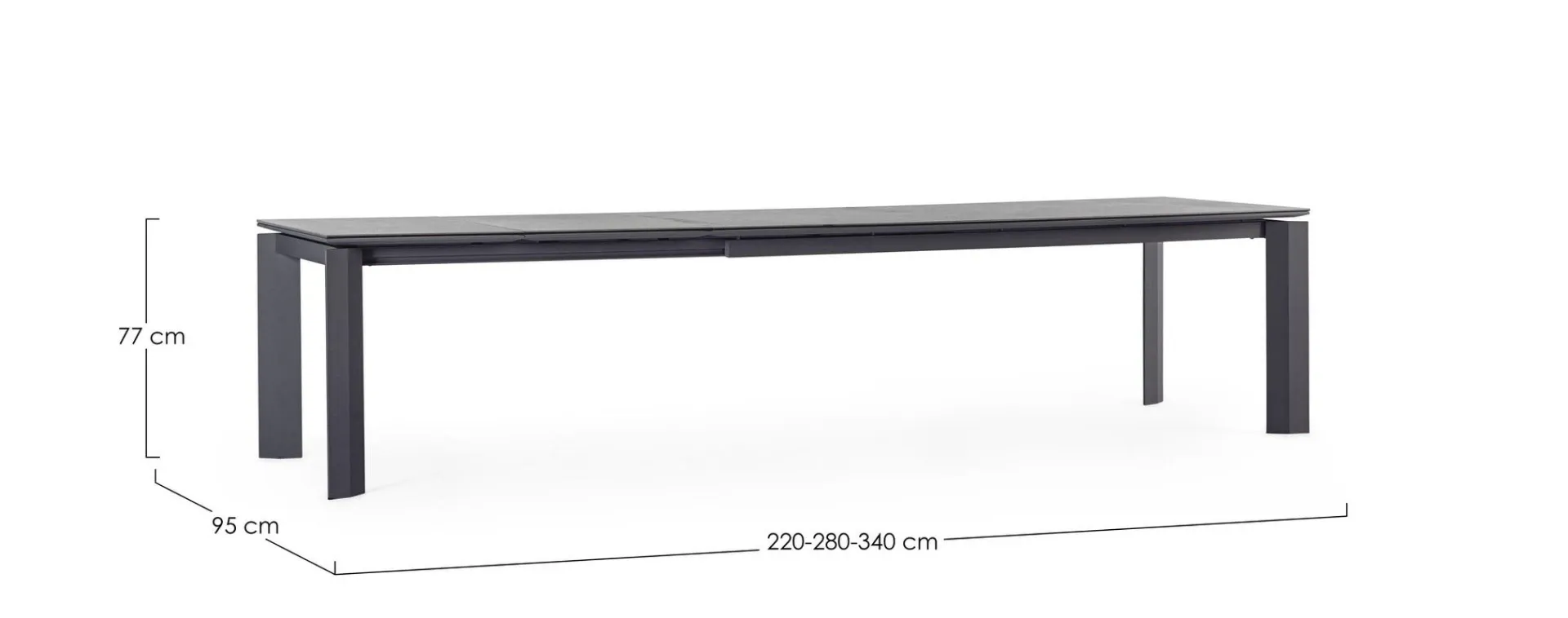 Un tavolo bellissimo e spazioso, perfetto per chi ama ricevere ospiti e vivere momenti conviviali all aperto, infatti può ospitare da 8 a 14 persone. Con un design elegante e moderno, si trasforma con un semplice gesto: da 220 cm si allunga a 280 e poi fino a 340 cm, rivelando tutta la sua versatilità. L apertura scorrevole è fluida e discreta, permettendo di estendere il piano con naturalezza, senza sforzi. Quando è chiuso, mantiene un aspetto armonioso e compatto; quando si allunga, accoglie con generosità amici e famiglia, rendendo ogni occasione ancora più speciale.