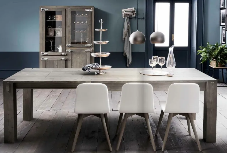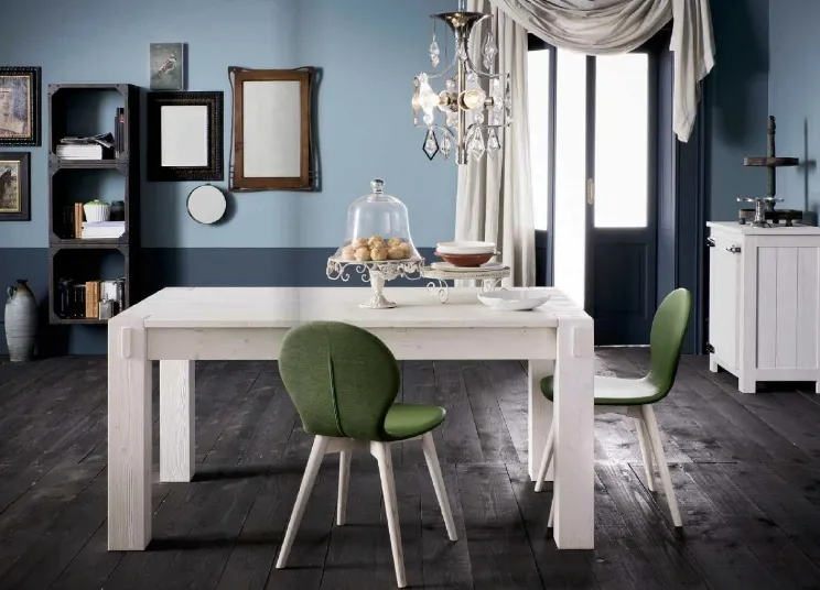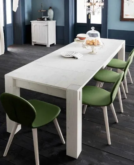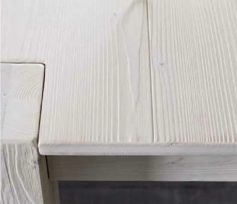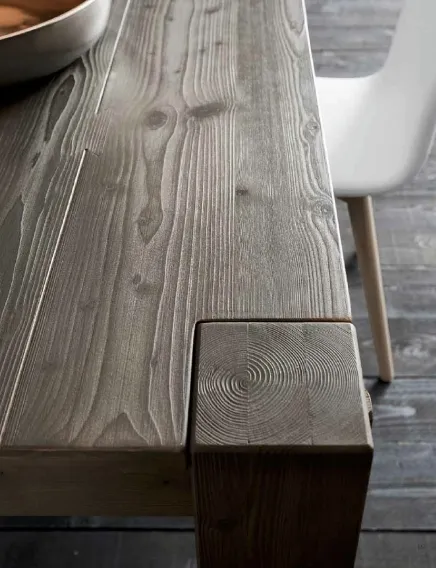 Tavolo interamente in abete, con gambe 12x12, disponibile in 4 finiture (foto): bianco, cenere, capuccino, nero. Il tavolo misura cm 160x90 ed è allungabile con 2 allunghe fino a 250 cm (con uno step intermedio di 205 cm). Nell'abete si evidenziano in maniera più o meno accentuata i nodi e le venature (rese ancora più accentuate dalla spazzolatura) del legno, tutto questo fa di ogni tavolo un pezzo unico.