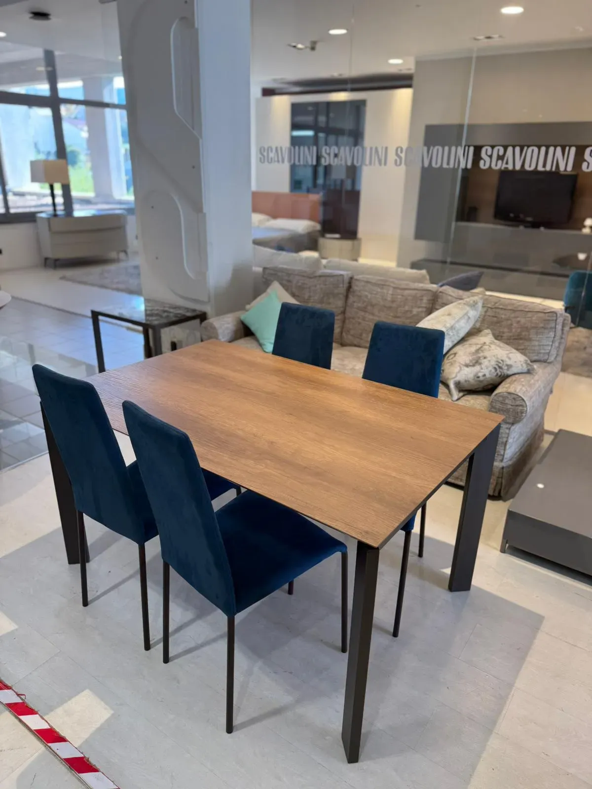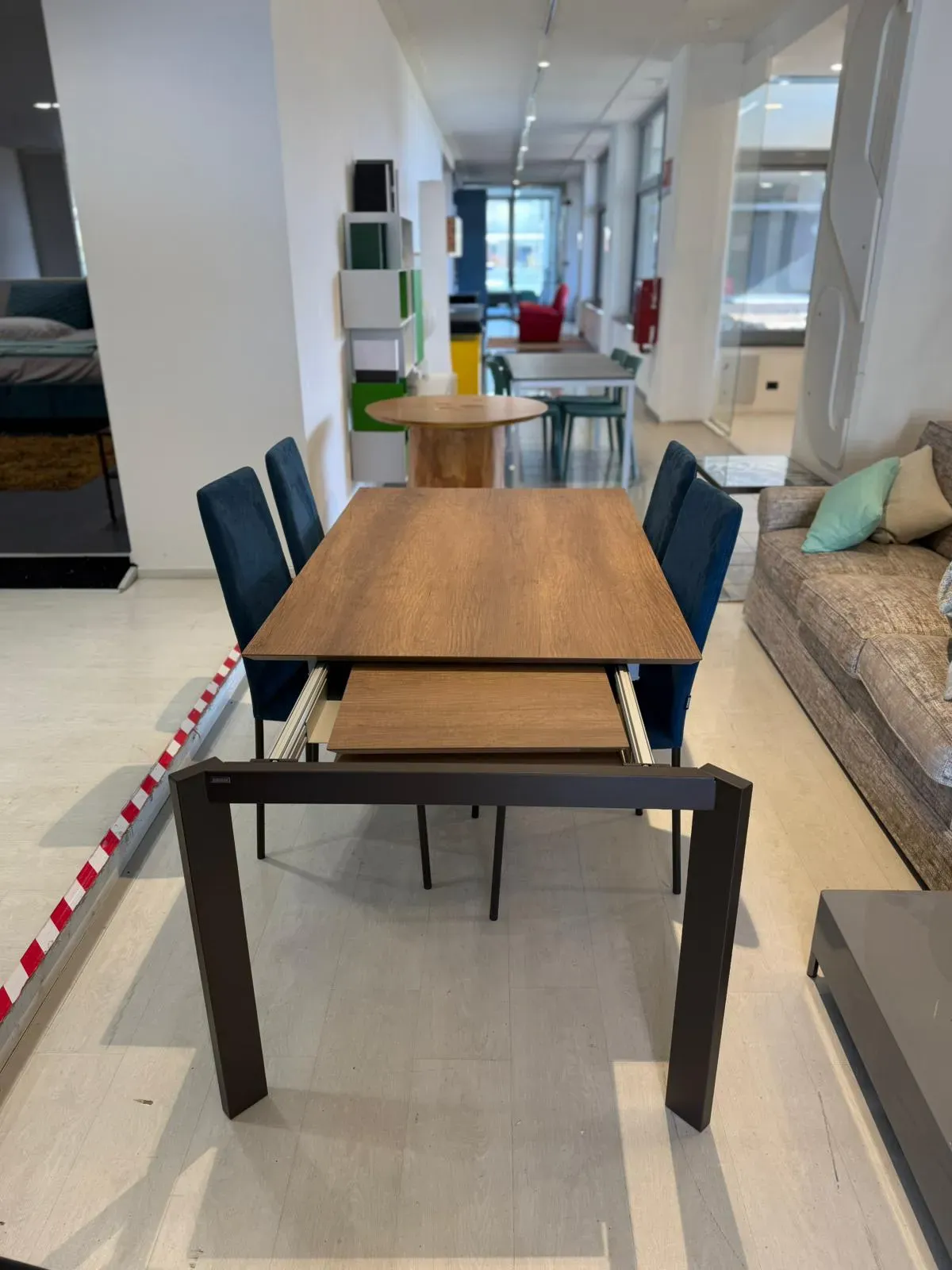 Il tavolo Space di Scavolini: gambe in metallo verniciato, piano allungabile in laminato, misura compatta e allunga fino a 240 cm. Offerto in outlet con sconto.