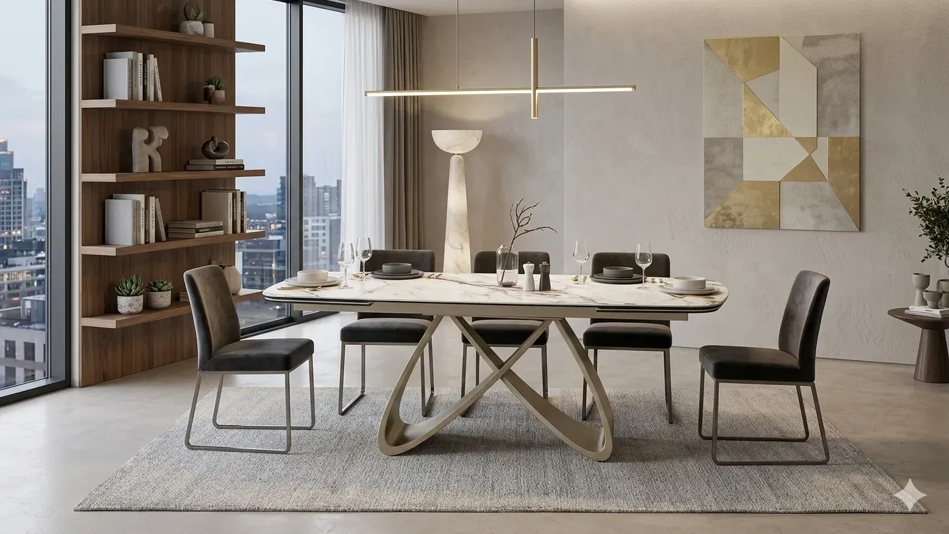Il tavolo Aurelio, , è un vero gioiello di interior design che fonde una struttura scultorea con la massima praticità tecnologica. Il pezzo forte è il basamento in metallo color champagne: un gioco di linee fluide e incrociate che donano un tocco di lusso contemporaneo e raffinato alla zona giorno.