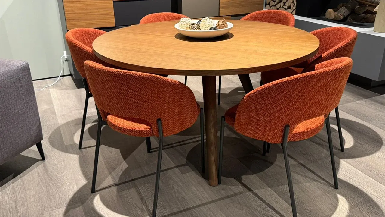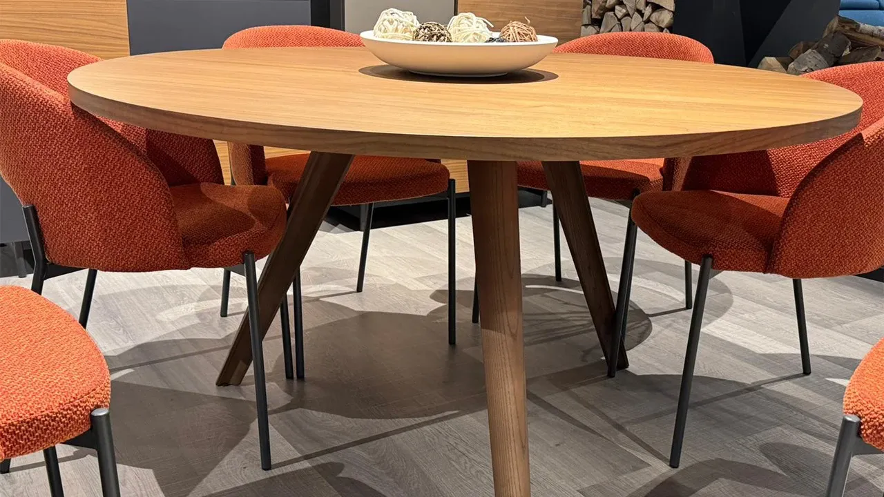 Tavolo tondo Bistrot fisso noce canaletto con gambi in legno Ø 140 cm.