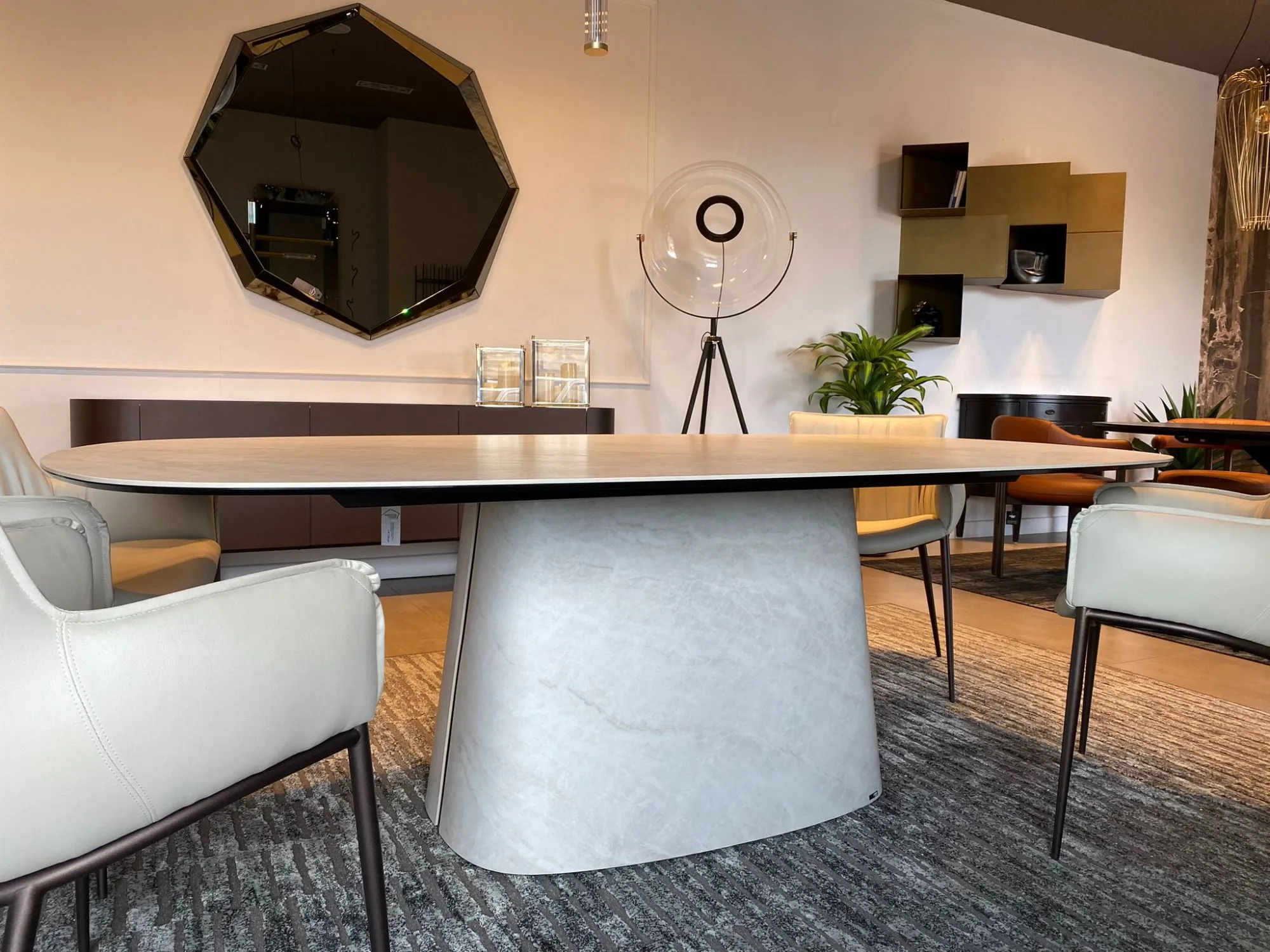 Una struttura con basamento centrale ultima il valore estetico del tavolo Ovale qui disponibile, che si confermerà in tal modo protagonista del soggiorno o della cucina dove sarà collocato, grazie alla sua figura di gran classe.
