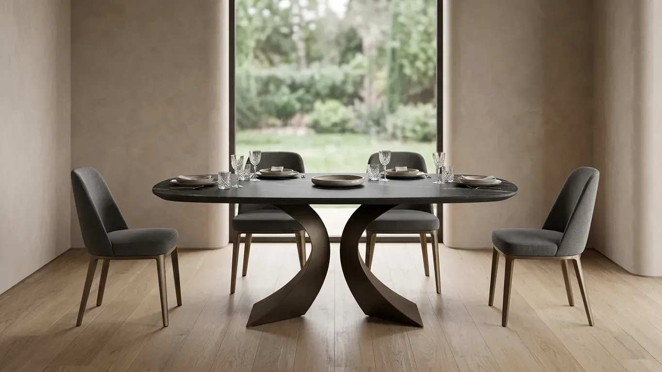 Il piano è un capolavoro di praticità ed estetica: realizzato in ceramica opaca color marmo nero, offre una superficie setosa al tatto e incredibilmente resistente a graffi, calore e macchie. I bordi arrotondati non solo ingentiliscono la silhouette del tavolo, ma garantiscono una maggiore sicurezza e comfort nell'uso quotidiano.