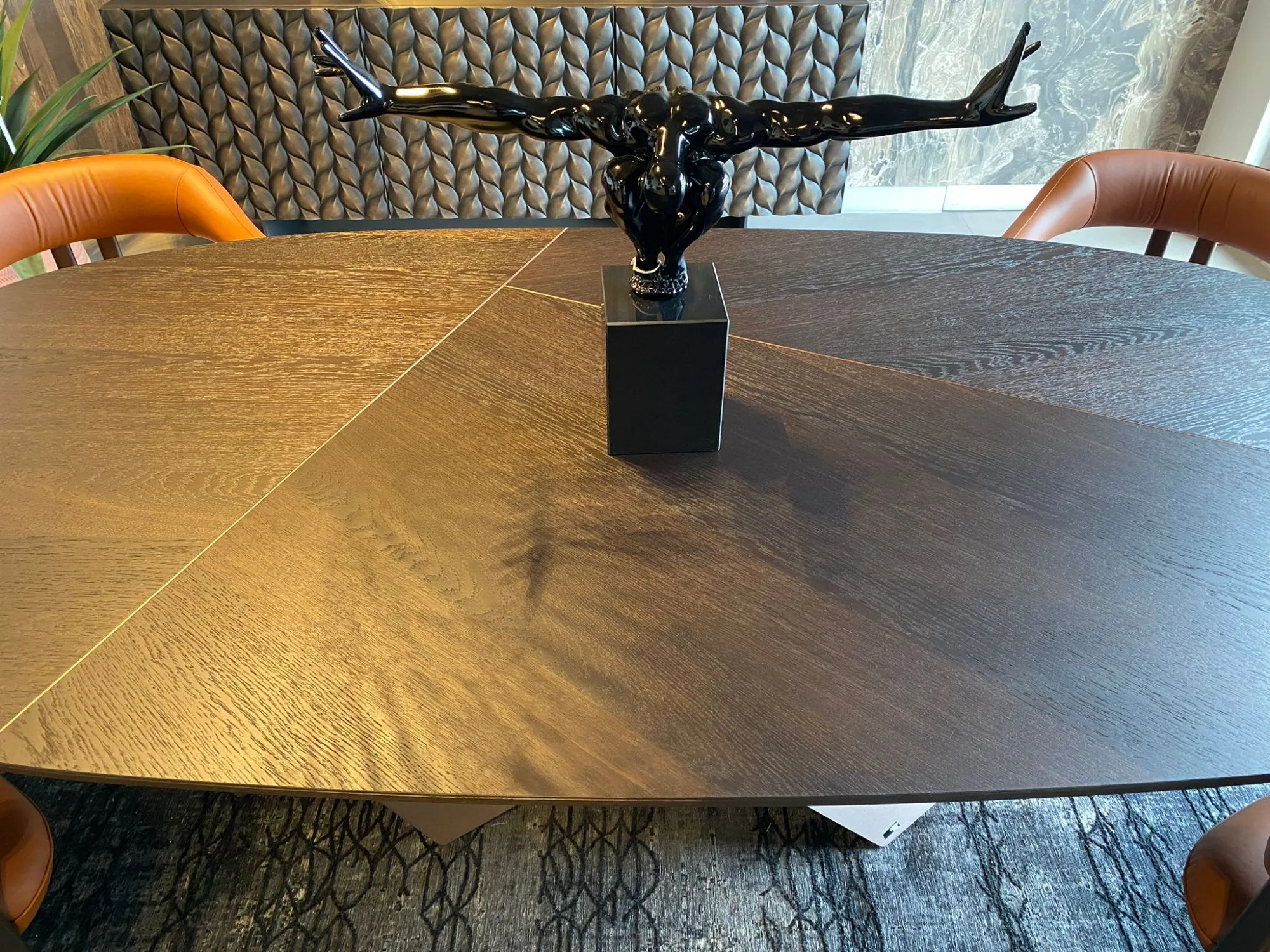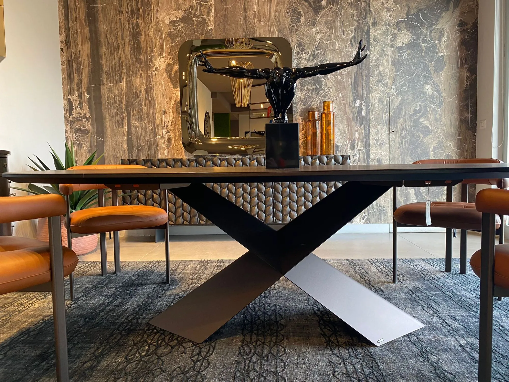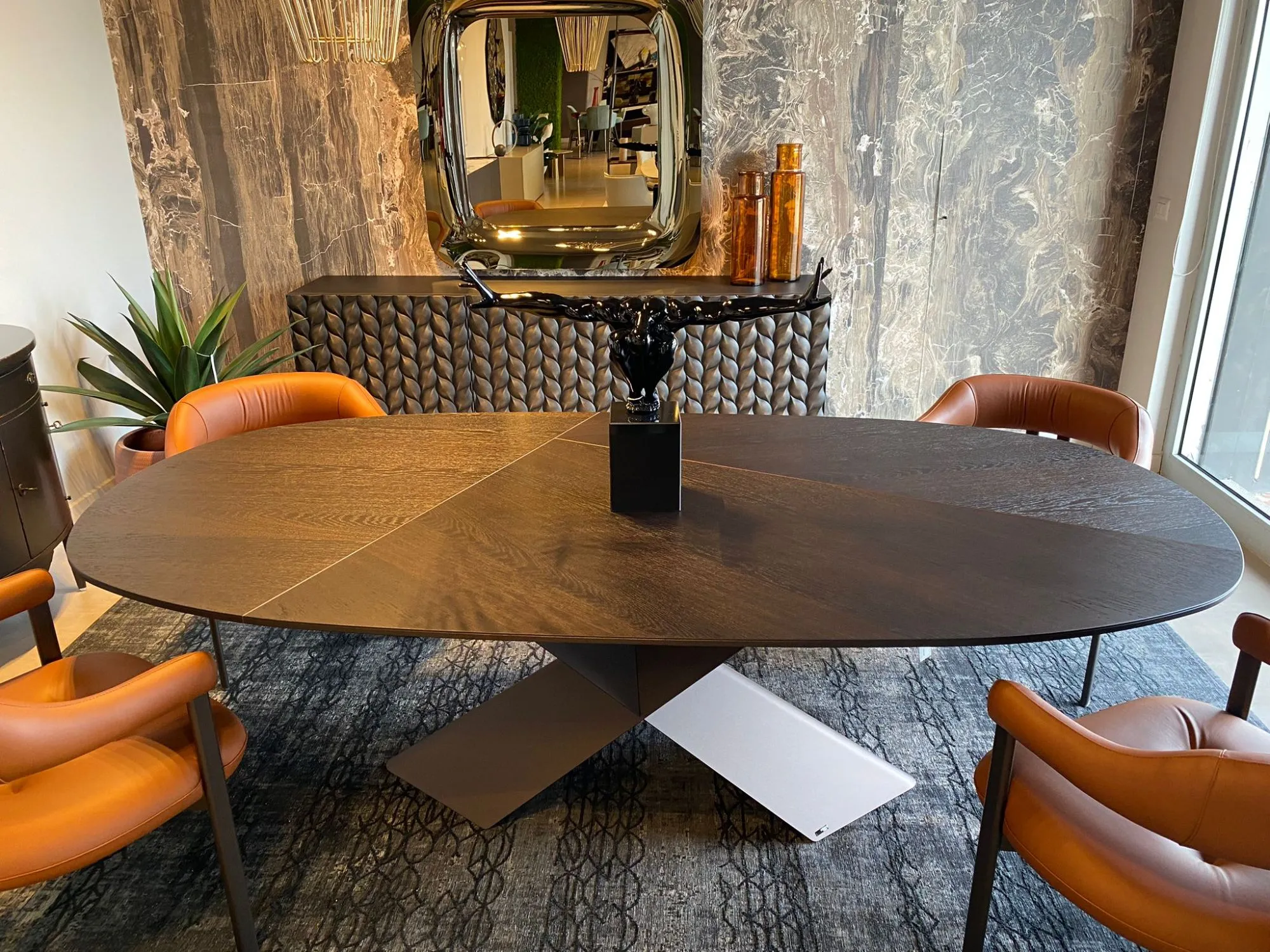Linee ben studiate ed un effetto visivo di gran classe connotano la struttura con basamento centrale del tavolo qui presente: complessivamente, l'estetica del modello Tyron wood y Cattelan italia non ti deluderà.