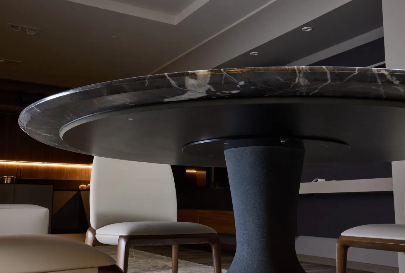 tavolo rotondo con scultorea base centrale in quarzo resinato effetto pietra, a forma di vaso greco