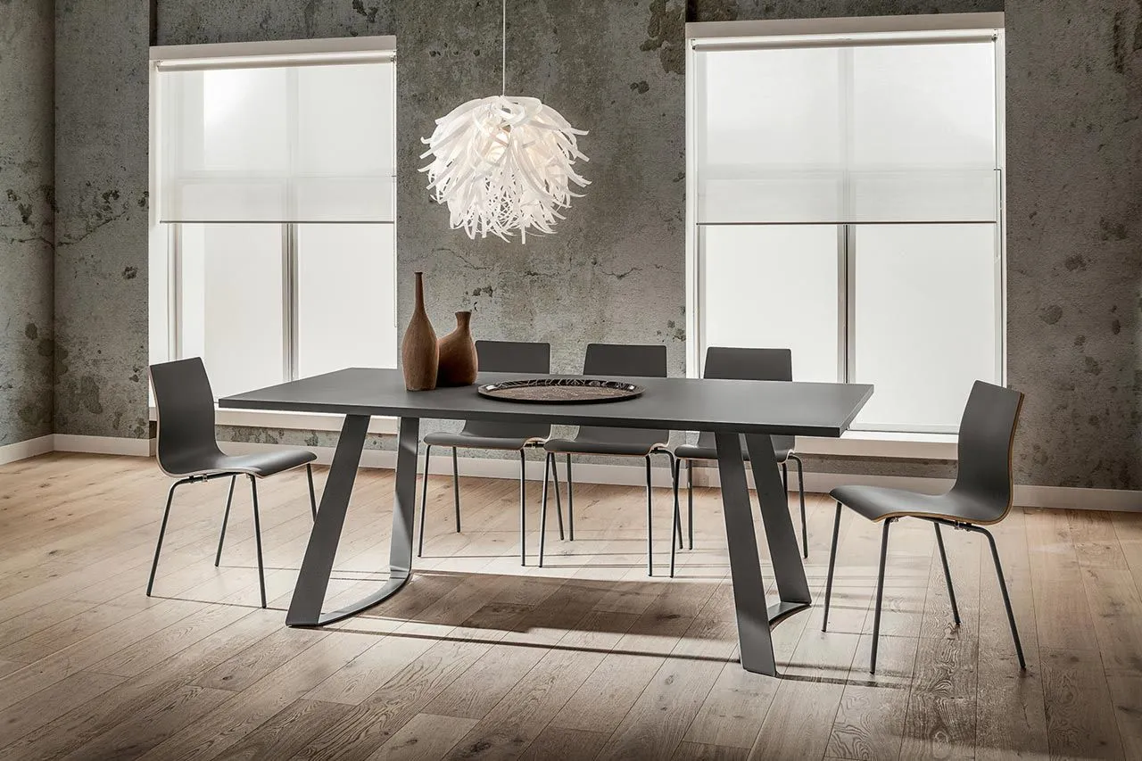 Il tavolo Bruno ha uno stile contemporaneo con linee essenziali. La combinazione di metallo antracite e rovere lo rende adatto a ambienti moderni e di design.