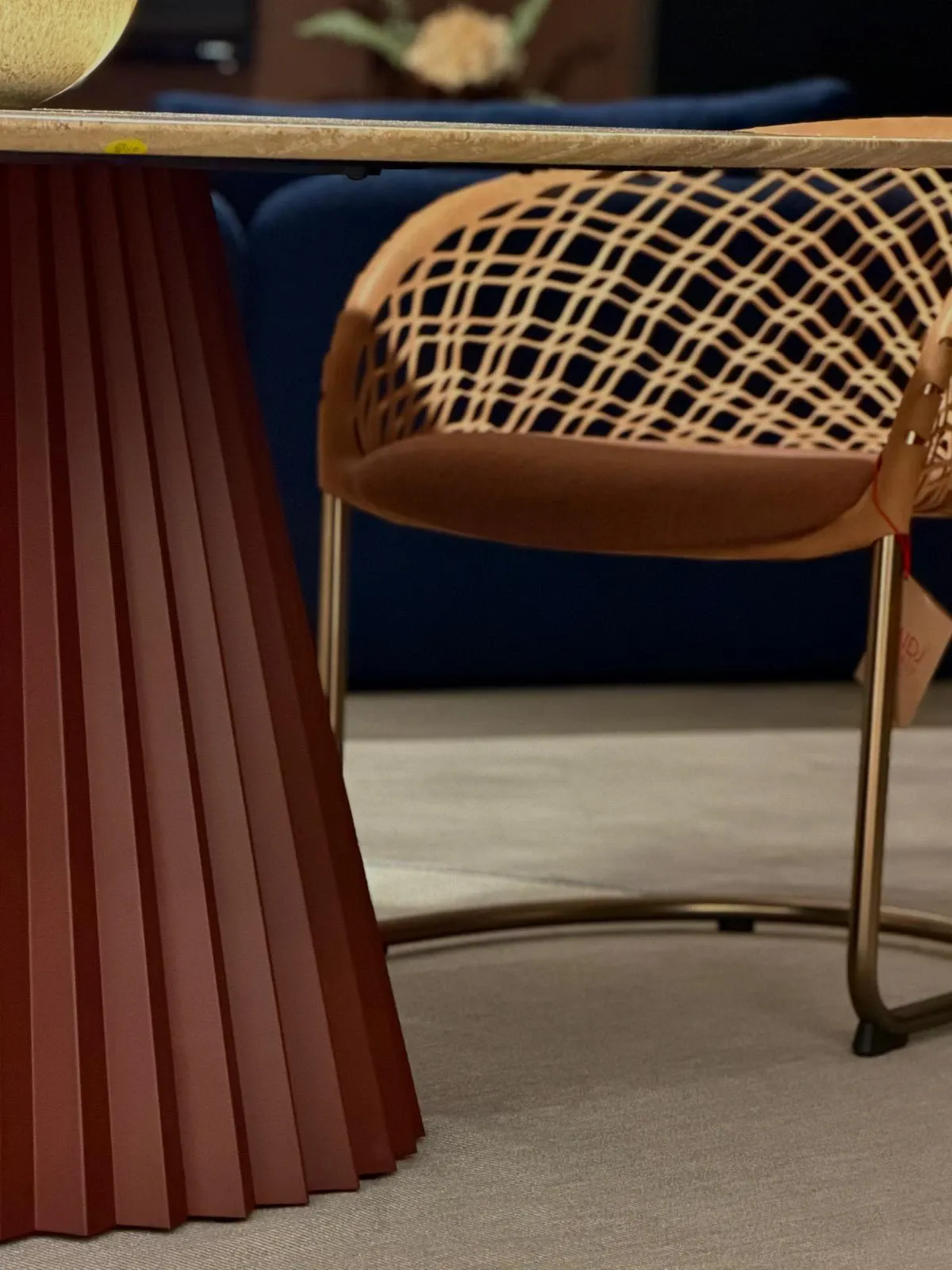 La base, nell intensa finitura Rosso Bulgaro, è il tratto distintivo del modello Plissé: un elemento scultoreo dal forte impatto visivo, capace di trasformare il tavolo in un autentico protagonista dello spazio.