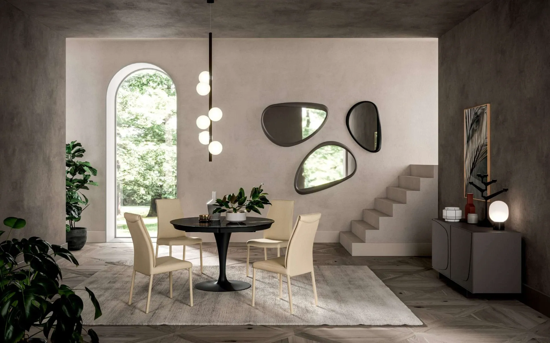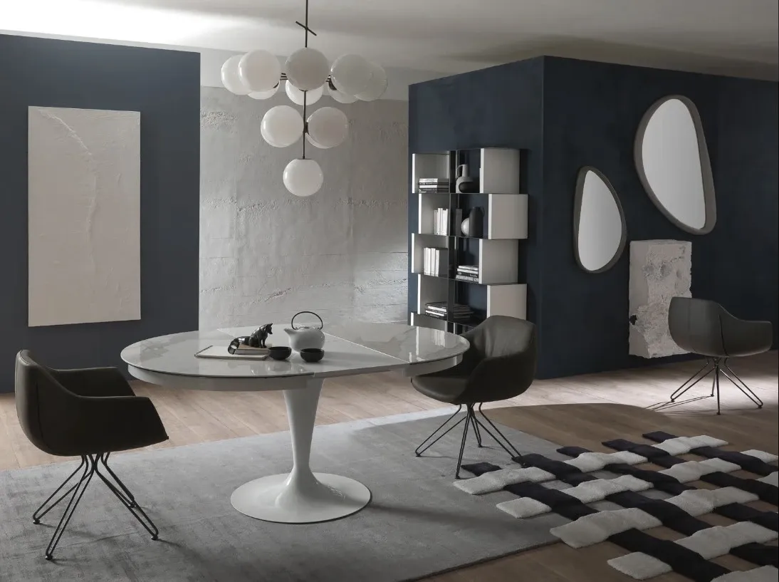 Eclipse con un design a tutto tondo per un tavolo minimal, sobrio ed elegante. L affusolata base centrale disimpegna lo spazio sotto al piano per un maggior comfort. Un allunga celata al suo interno permette di accogliere fino a 8 persone.