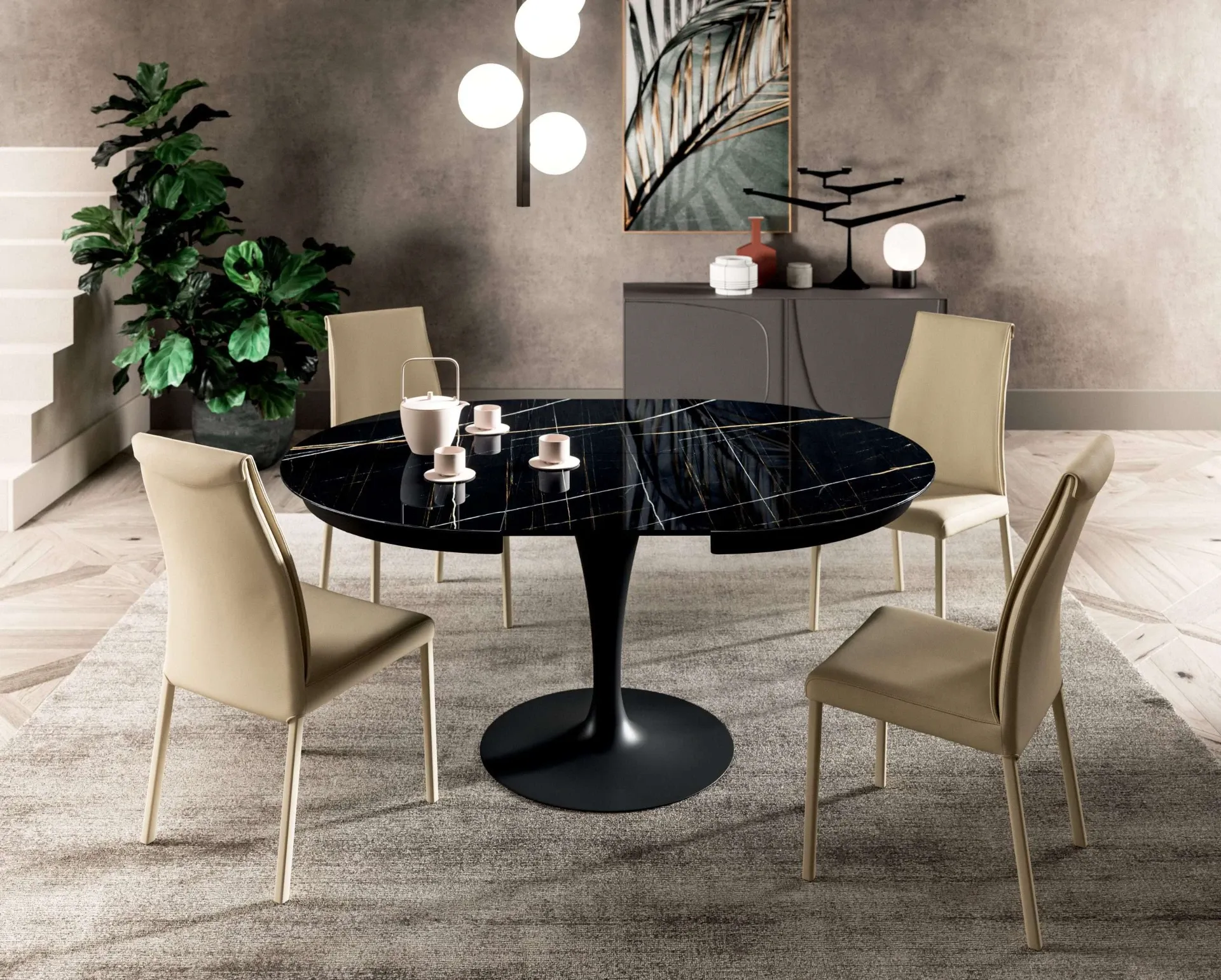 Tavolo da pranzo allungabile con allunga interna a libro e basamento in metallo verniciato. Nella finitura di piano Marble Glass piani e allunghe mantengono continuità nel disegno sia chiuso che aperto, mentre nella versione ceramica la venatura è continua a tavolo chiuso. Allunga interna a libro in nobilitato per le finiture cristallo, cristallo antimpronta e ceramica.