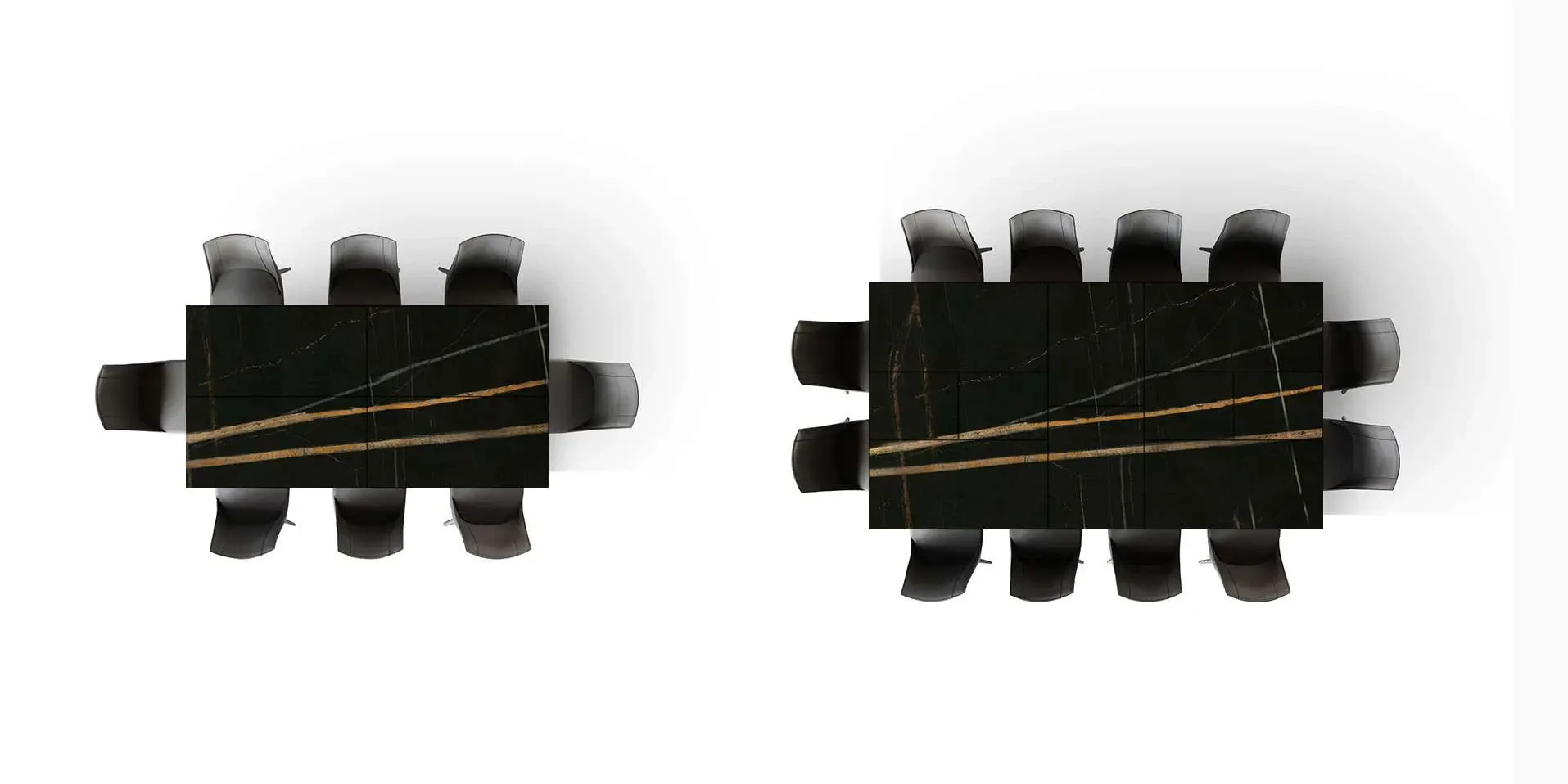 L innovativo tavolo 4×4 dispone di un sistema di apertura esclusivo, in grado di estendersi sia in larghezza che in lunghezza. Infatti, 4×4 adotta un meccanismo basato sullo scorrimento geometrico dei piani che consente di passare da cm 200×100 nella versione chiusa a un estensione di cm 254x138 quando è aperto.