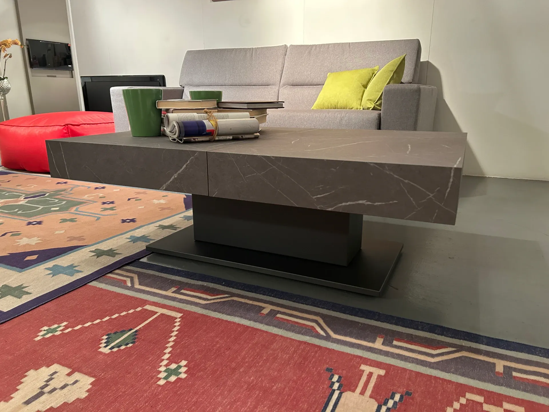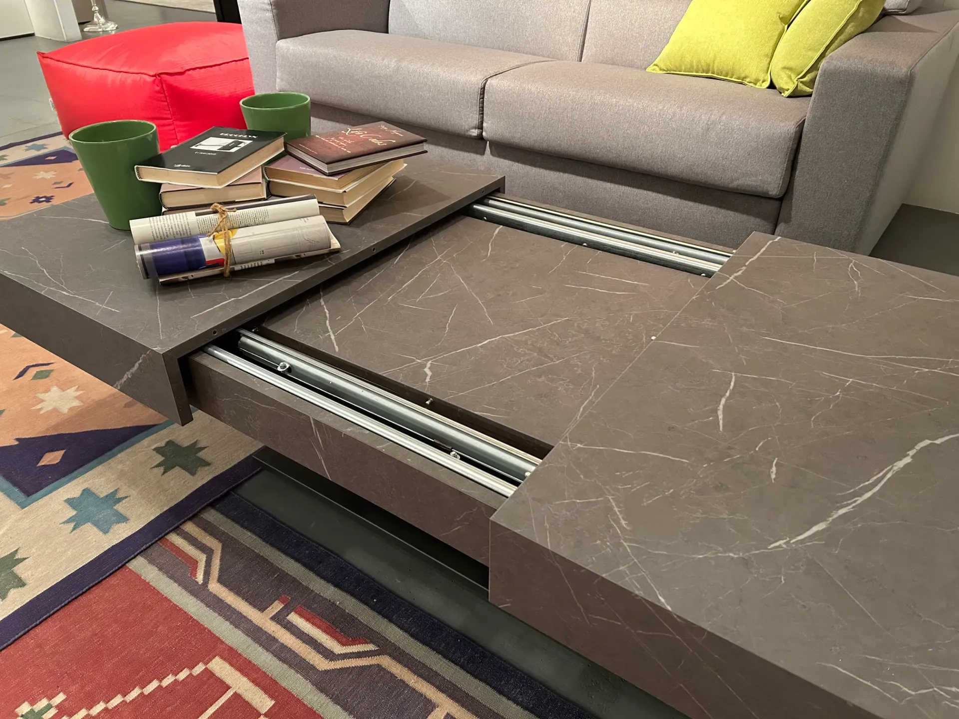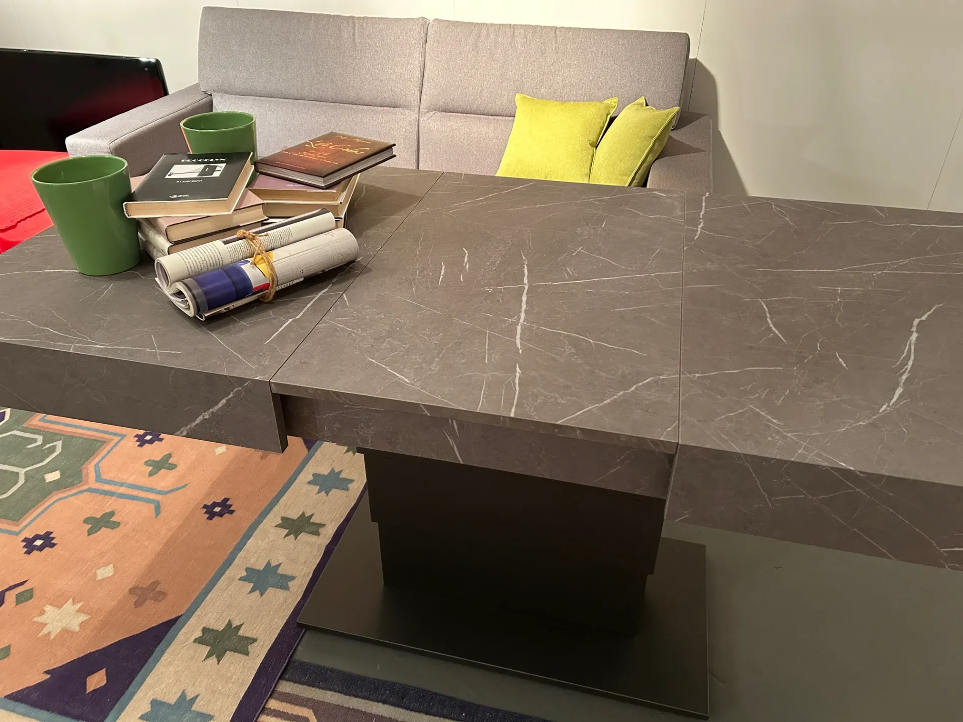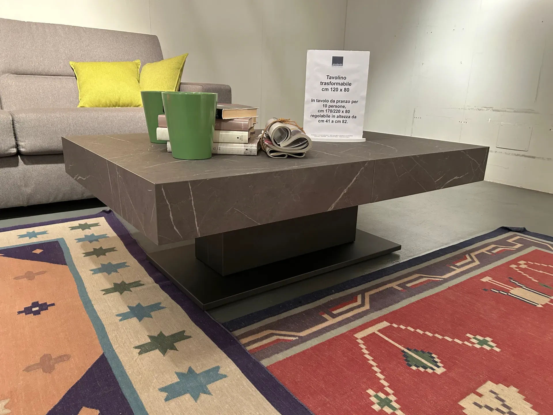 Tavolino trasformabile in tavolo da pranzo, dimensioni cm 120x80 allungabile a cm 220, 2 allunghe inserite nel piano ,dotato di rotelle per spostarlo facilmente, possibilità di alzarlo da cm 30 a cm 80 anche altezze intermedie. Realizzato in laminato alta resistenza nero con venature bianche .,