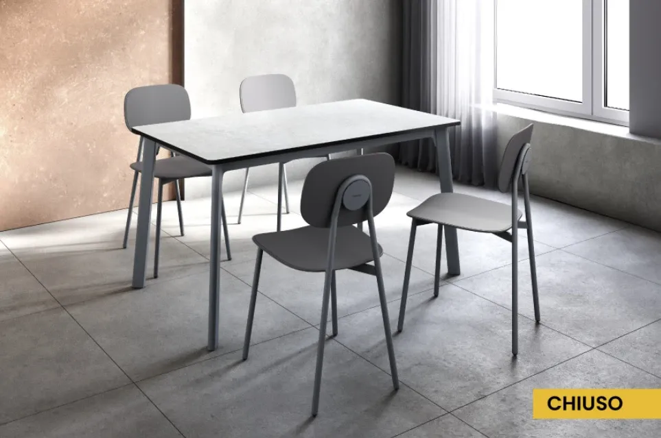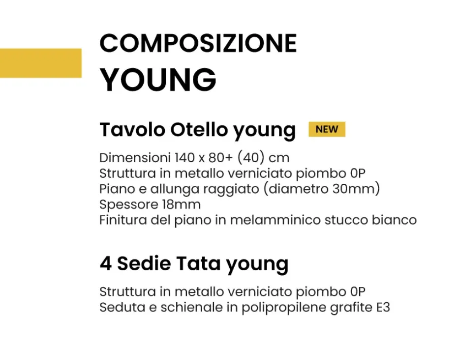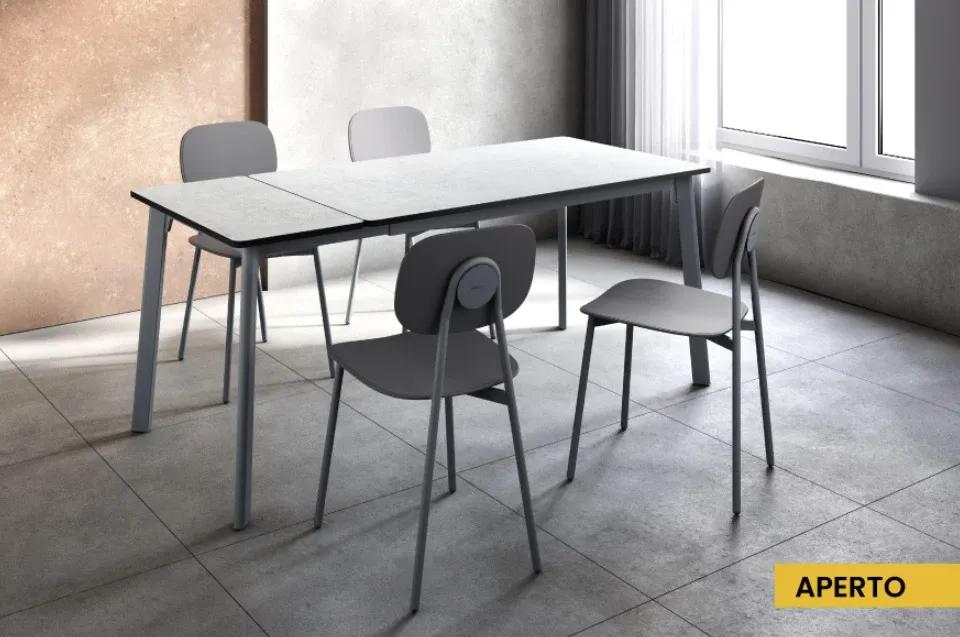 Offerta Outlet su tavolo allungabile e 4 sedie in PRONTA CONSEGNA!! Tavolo modello Otello Plus di dimensione (da chiuso)140 x 80 cm dotato di N.1 allunga contenuta all'interno del tavolo da 40 cm - Dimensione aperto del tavolo 180 x 80 cm - particolarità del tavolo modello "Otello Plus" sono gli angoli del piano e dell'allunga raggiati. Struttura In metallo finitura GRIGIO PIOMBO OP - Piano e allunga in nobilitato STUCCO BIANCO sp. 18 mm - Comprese nel prezzo N.4 sedie modello Tata Young con struttura In metallo finitura GRIGIO PIOMBO OP e sedile - schienale in polipropilene Grigio Grafite E3