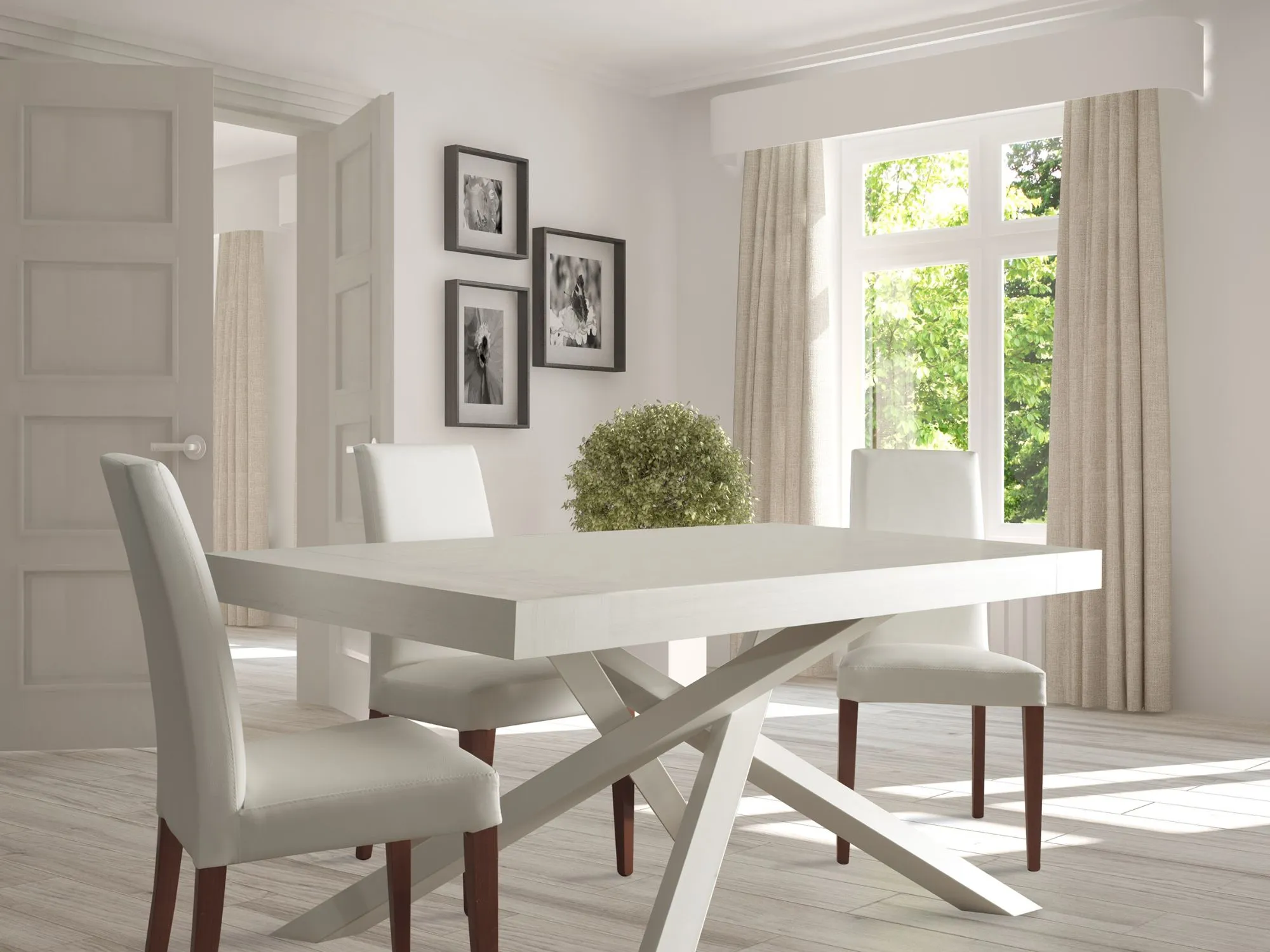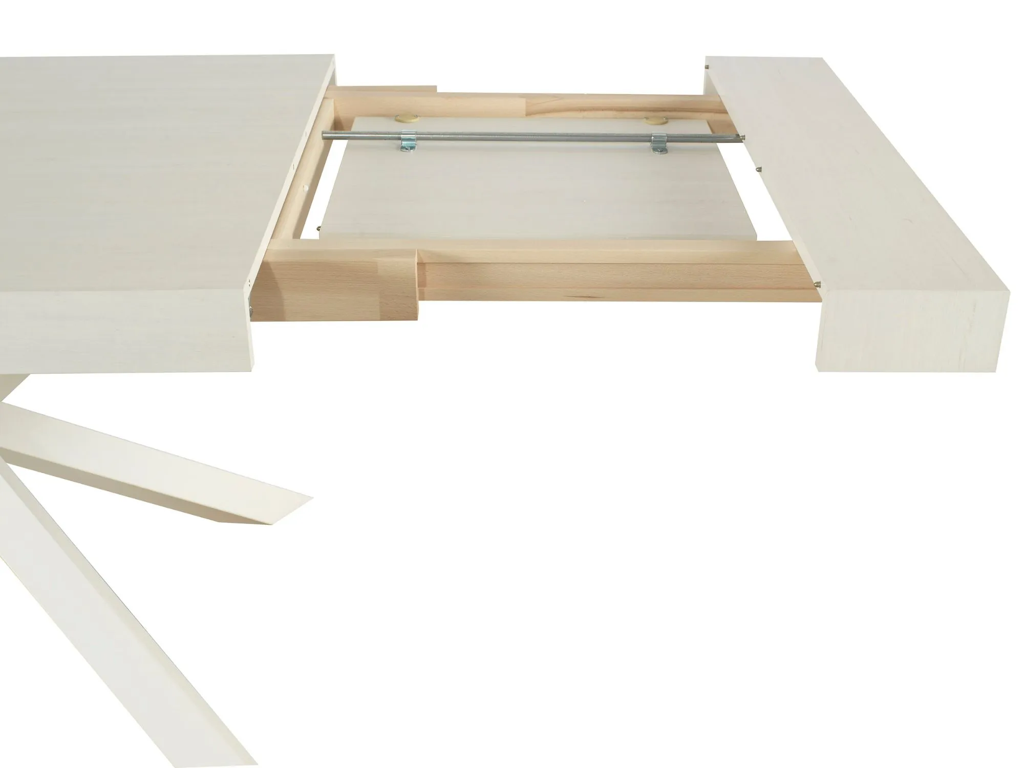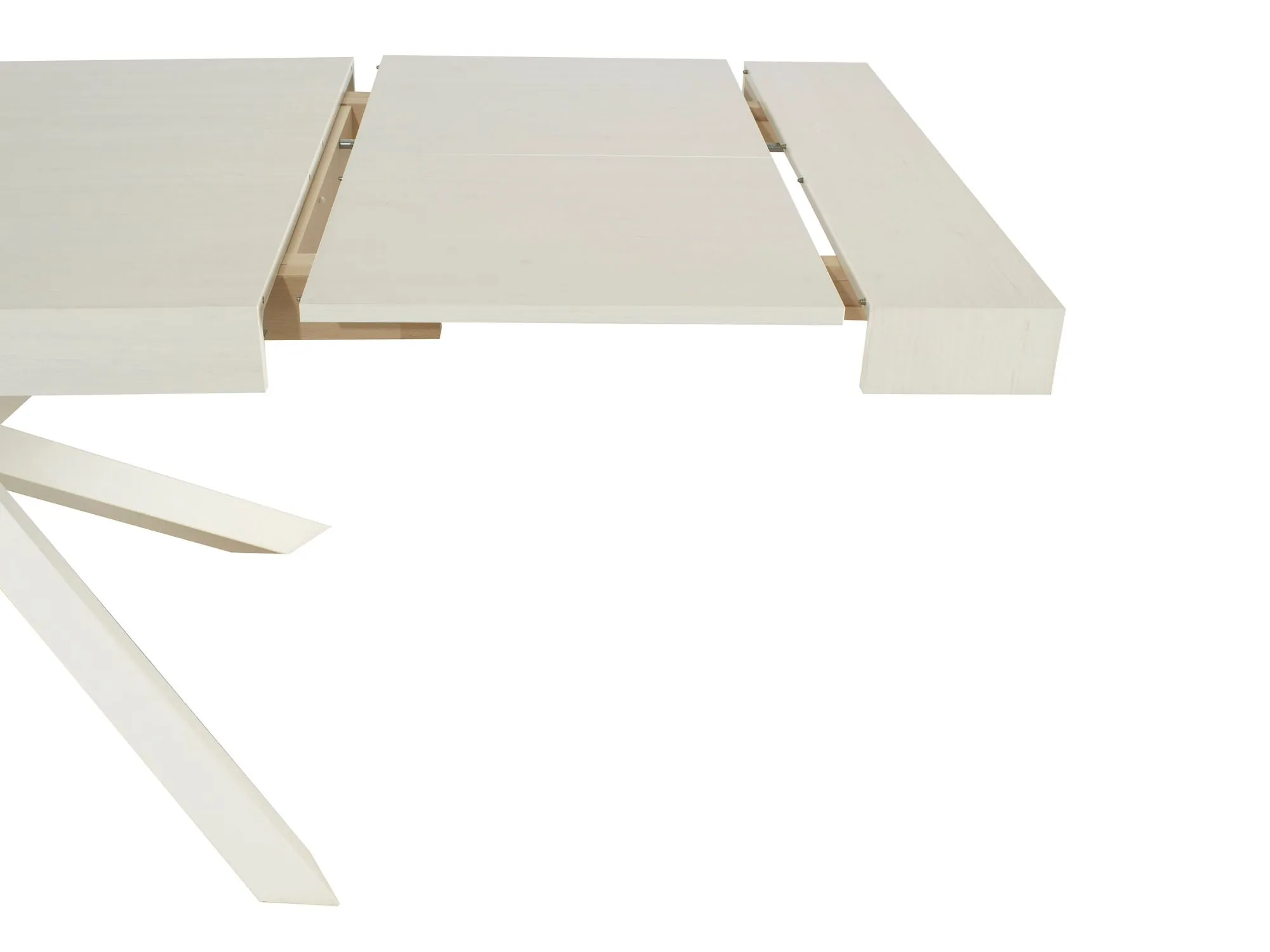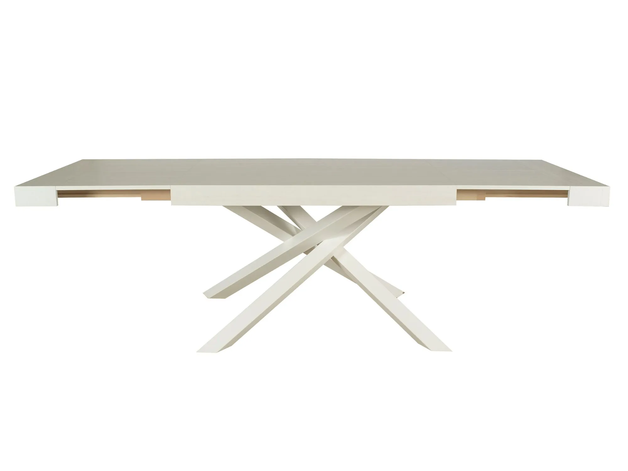 Tavolo MobiLike dal design contemporaneo e innovativo allungabile, con piano in nobilitato finitura bianco anticato e caratteristiche gambe incrociate in metallo verniciato di colore bianco anticato.